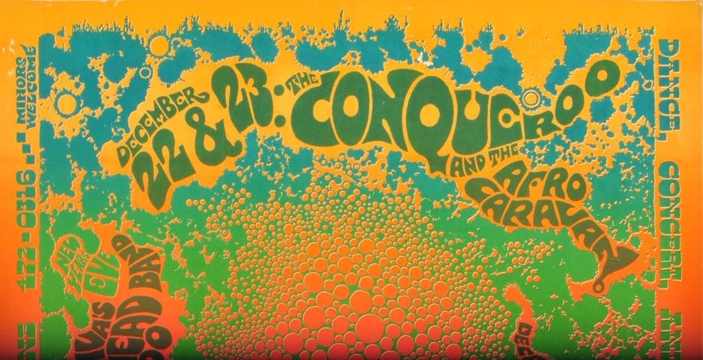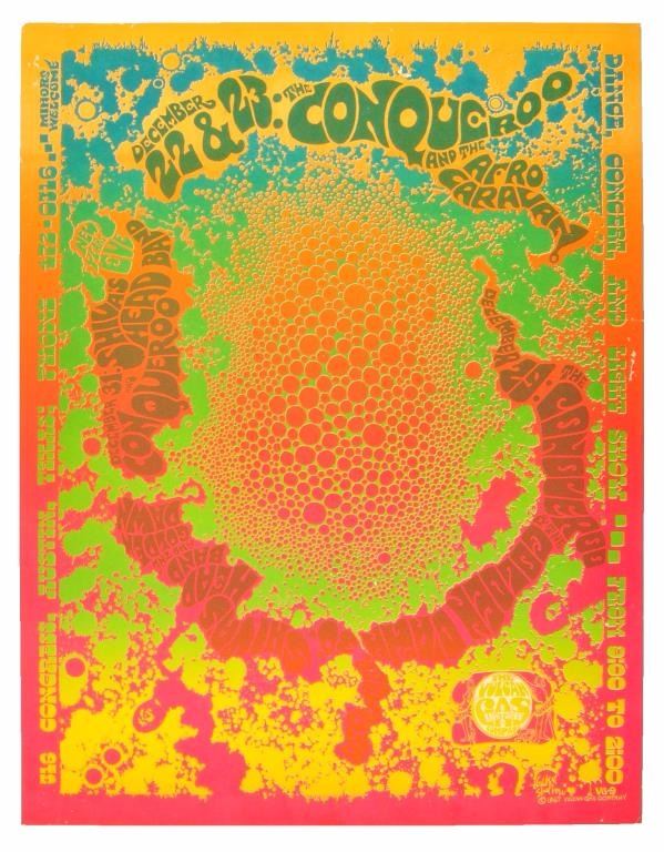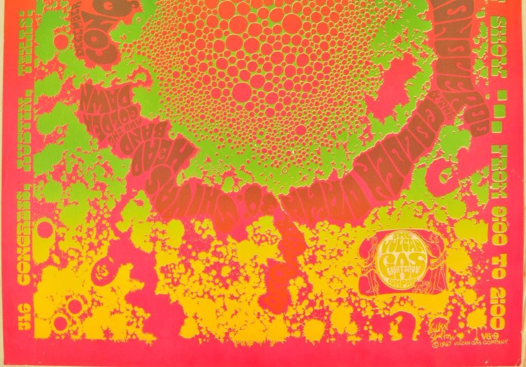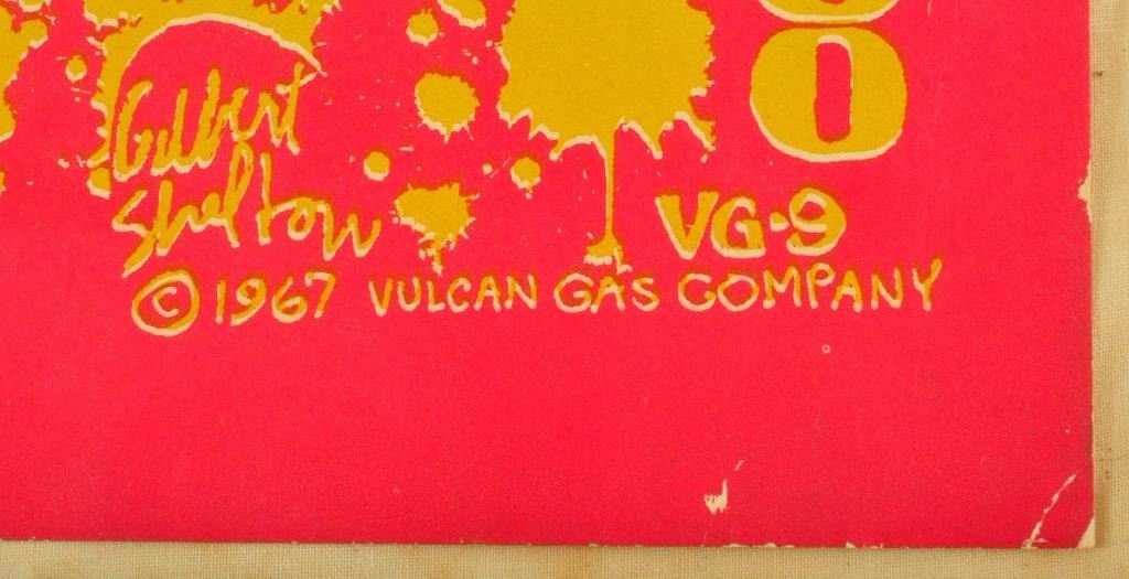 Vulcan Gas Co. VG#9. Featuring: Conqueroo, Shiva's Headband, Afro Caravan, & The Golden Daha. Artist: Gilbert Shelton, 1967. Linen backed. 21-1/2" x 28".