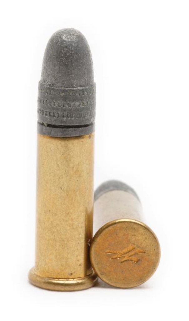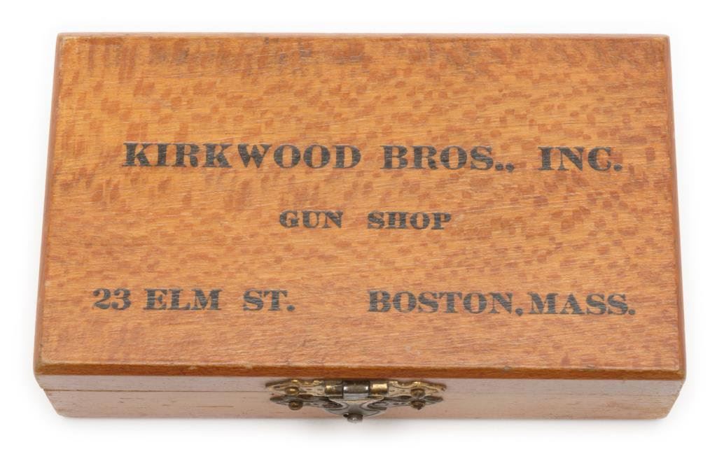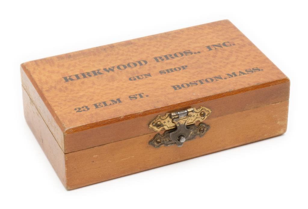 Beautiful dealer’s advertising wood case with 50 collector .22 caliber cartridges; box is brass hinged and appears to be made of birdseye maple. Top of lid is stenciled “KIRKWOOD BROS. INC., GUN SHOP, 23 ELM ST., BOSTON, MASS.”. In very good to fine condition. Est.: $50-$75.