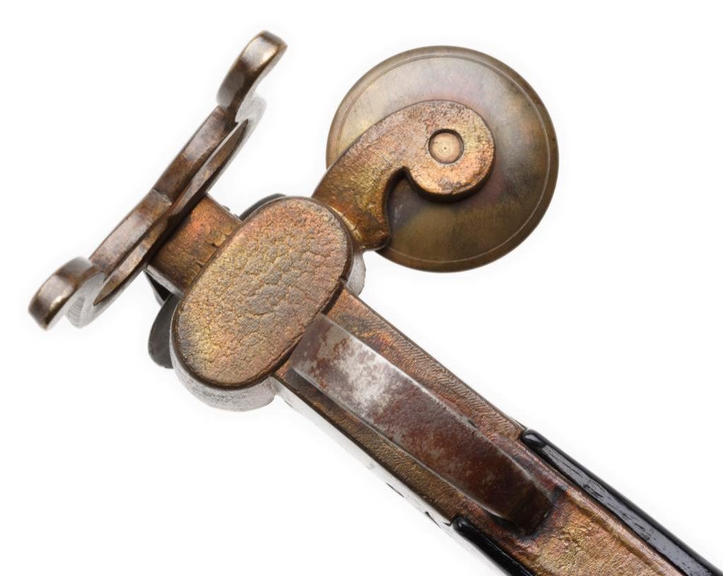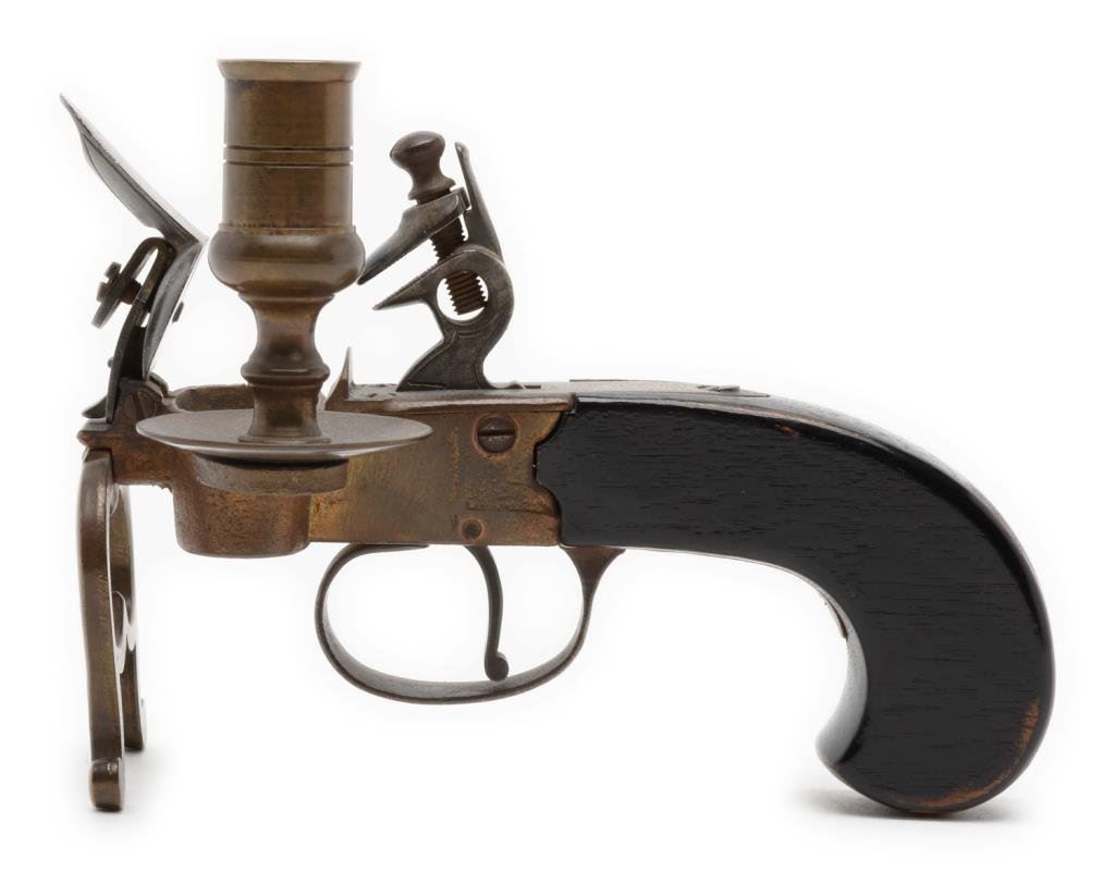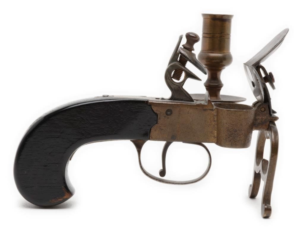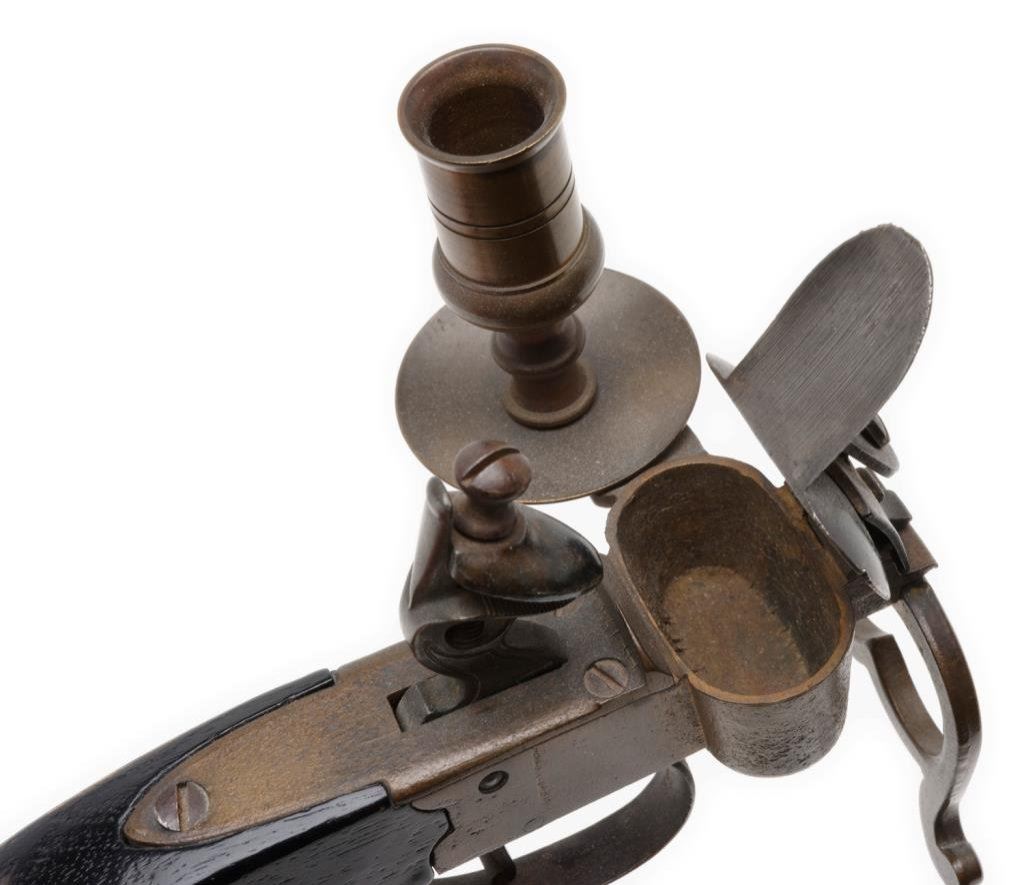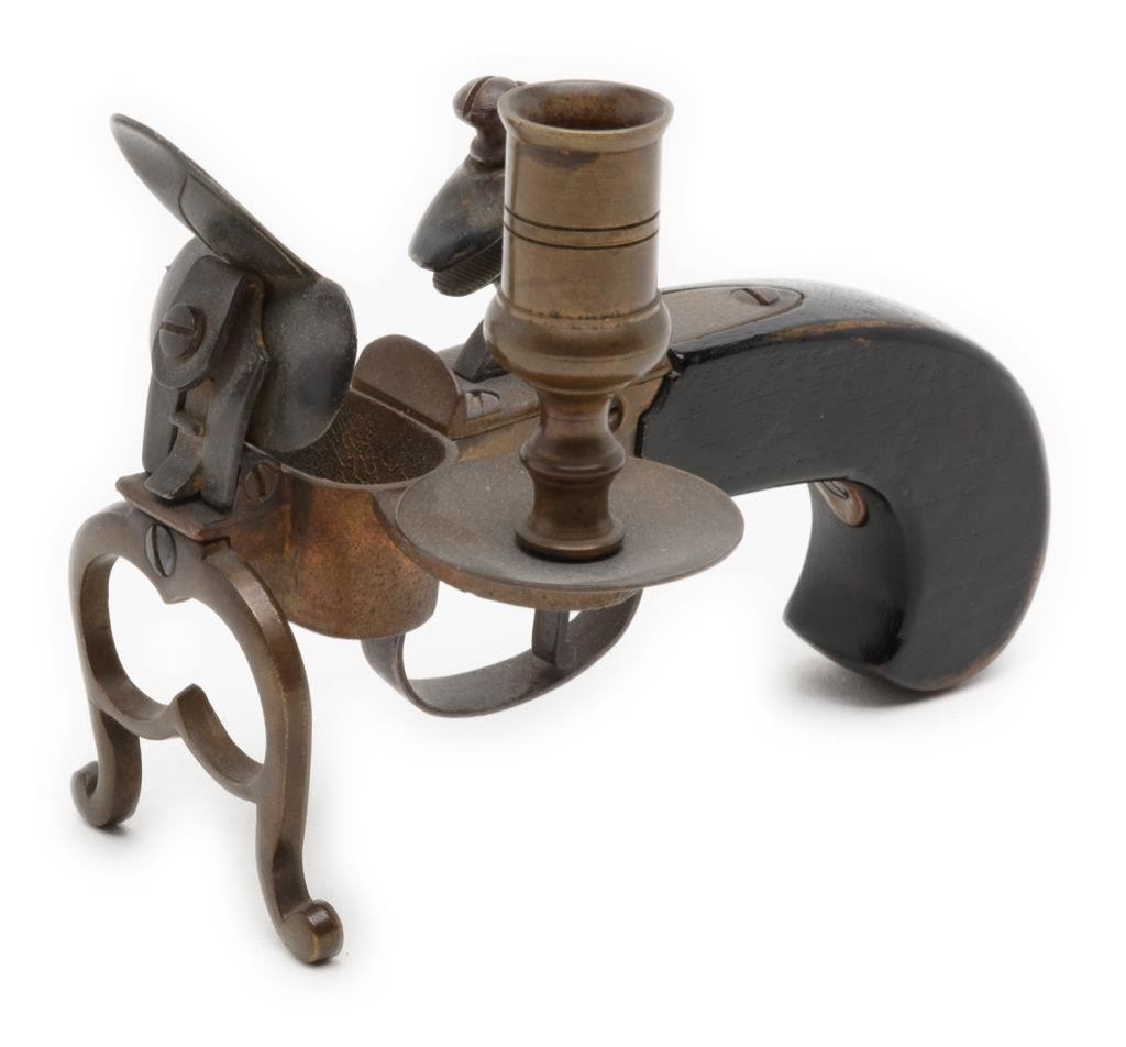Old reproduction flintlock brass and wood candle holder, likely made in the 1960’s era; approx. 5-1/2” long and 4” in height; beautiful dark patina. Well made. Est.: $50-$75.