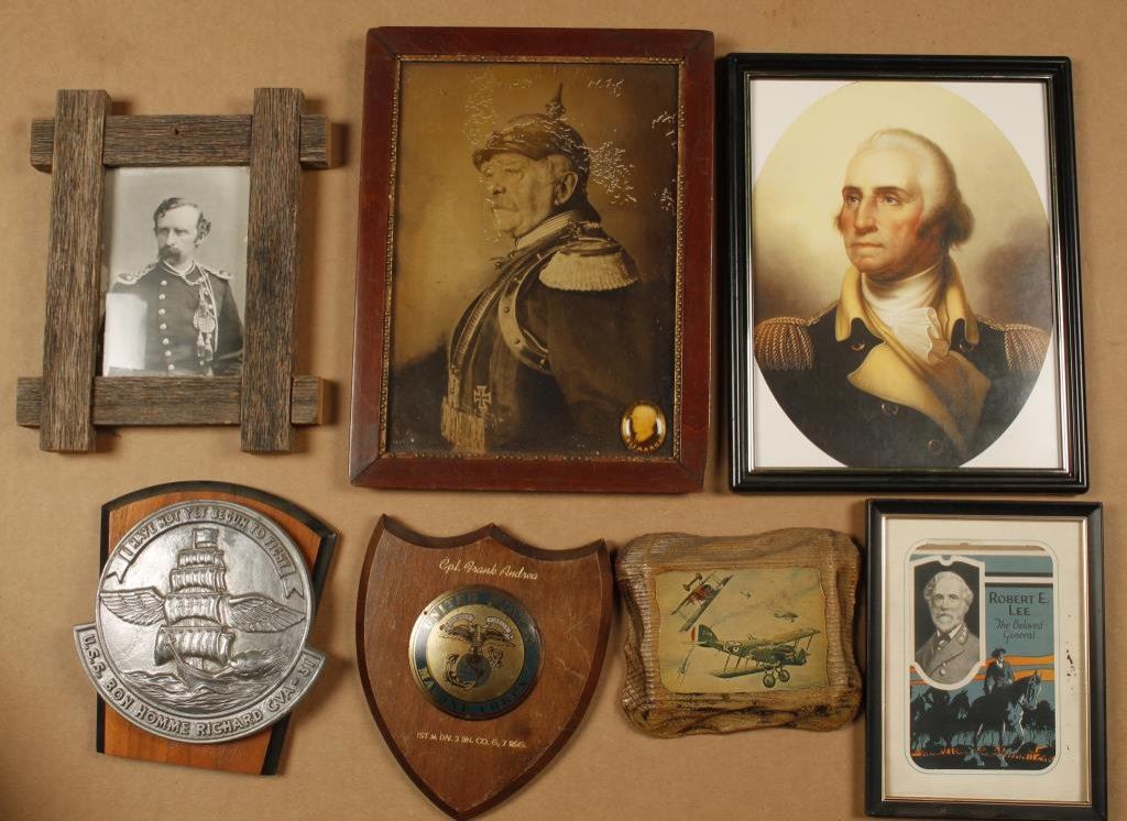 Lot of misc. military plaques and framed pictures including a decoupage of WW I air combat, a plaque commemorating the U.S.S. Bon Homme Richard CVA-31 and a U.S.M.C. plaque for Cpl. Frank Andrea, 1st M Div. 2 BN CO. G, 7 Reg. Also framed pictures of Gen. Robert E. Lee, General George Washington, General George A. Custer and German General Bismark. Est.: $50-$75.