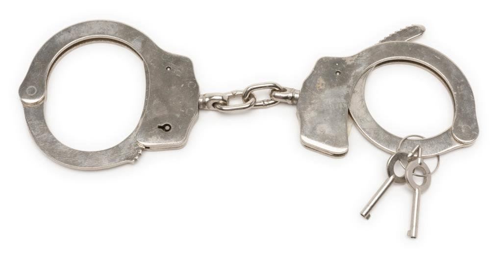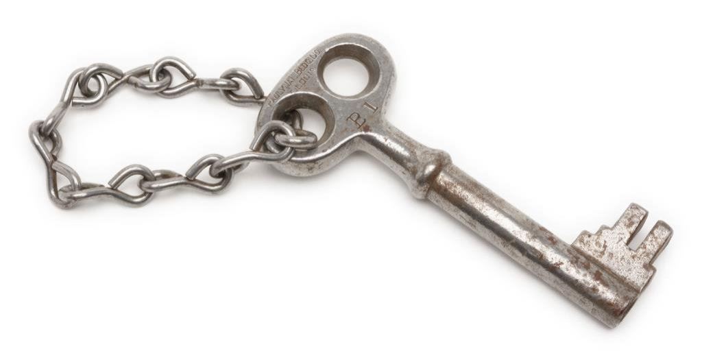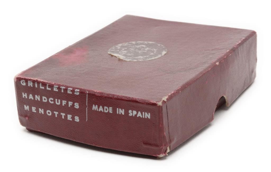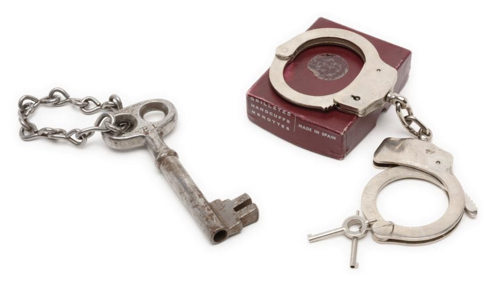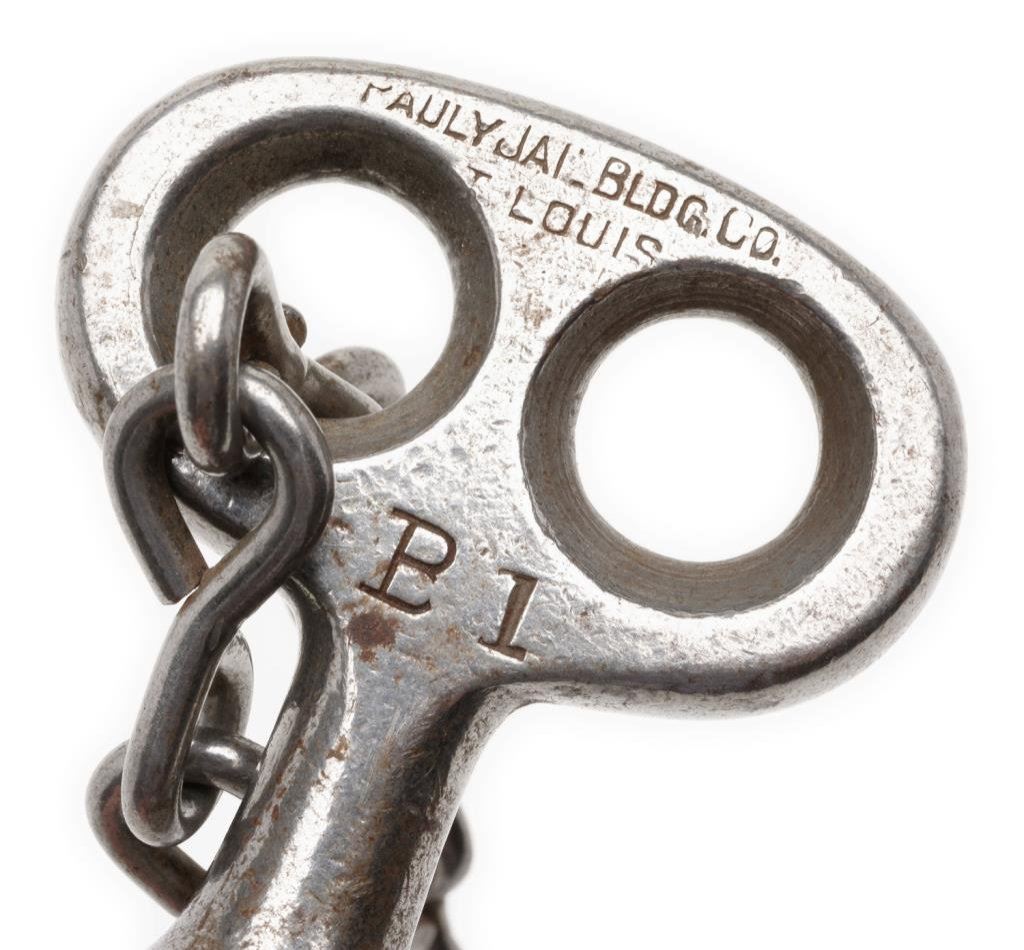Pair of nickel plated handcuffs with 2 keys marked “Taiwan” in maroon colored two-piece cardboard box marked “Grilletes Handcuffs Menottes”; also accompanied by a large old jail cell key marked “P1” and “Pauly Jail Bldg. Co., St. Louis”. Est.: $50-$75.