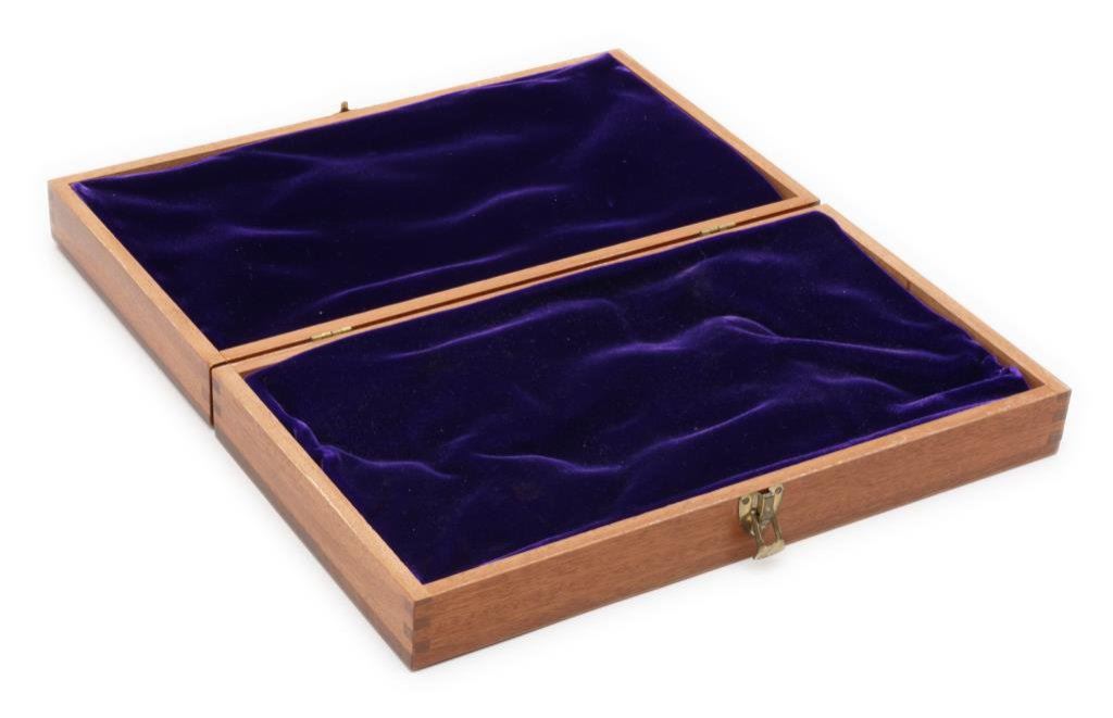 Wood presentation case for a revolver or pistol, approx. 14” x 8” x 3” with velveteen lining in overall fine condition. Est.: $35-$55.