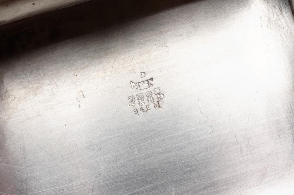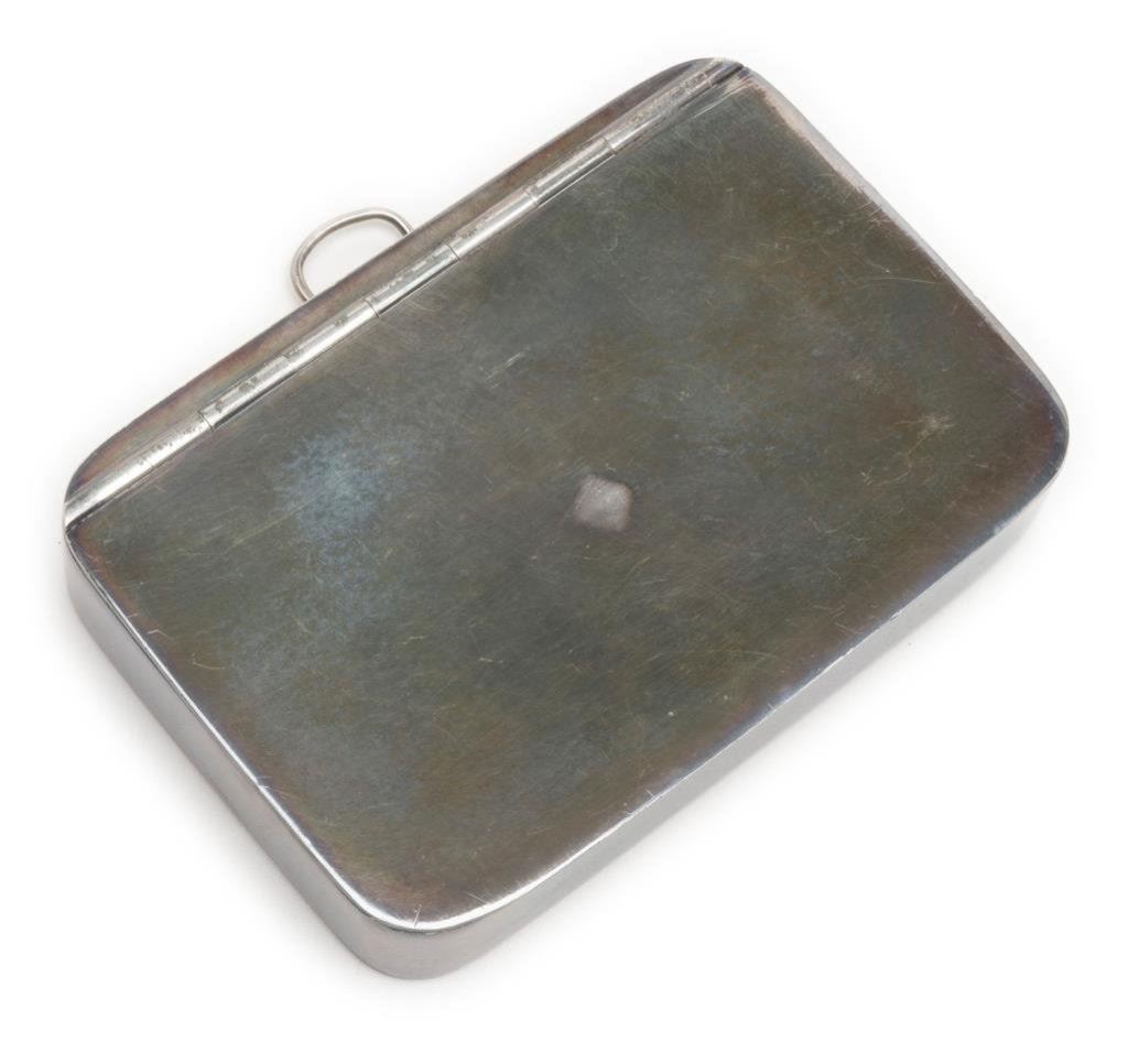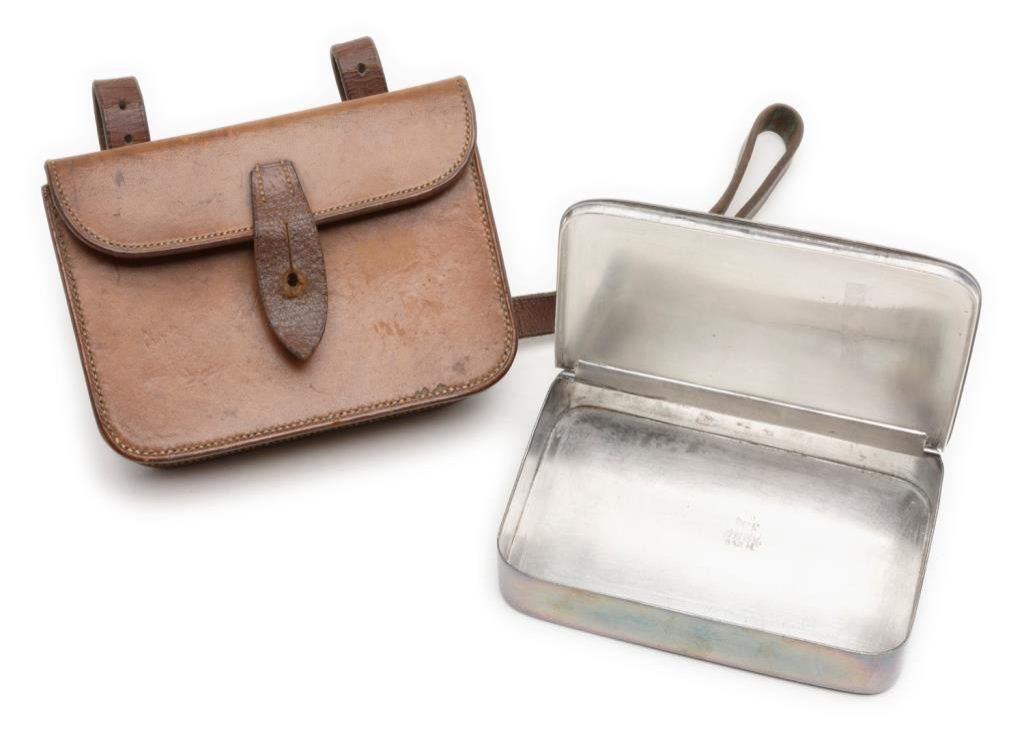 Interesting hallmarked silver plated metal container approx. 5-1/2” x 3-3/4” x 1-1/4” contained in a tan leather casing that is chamois lined with belt straps. The hallmarks include a “D” over a bugle and “JD&S over EPBM over 942 M”. The whole rig appears military; possibly for holding personal effects of an officer as it’s too nice to be a cartridge pouch! Est.: $75-$150.