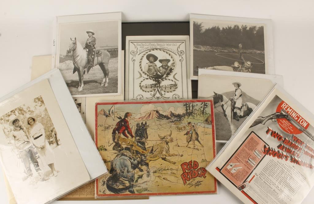 Interesting lot of misc. photos, prints and paper including an 1891 hand colored wood engraving of aspects of ranch life; 8 photos of Western and rodeo themes including a photo of Montie Montana and a framed advertiser for “Mr. & Mrs. E. O. Mickel, Novelty Whip Act and Bommerang Throwing; 6 game and 1 Western-related prints plus an old Red Ryder completed puzzle. Est.: $125-$175.