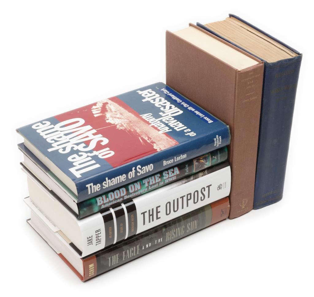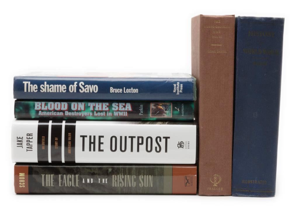 Lot of 6 hardback books on WW II including The Russo-German War, 1941-1945; The Outpost by Tapper and The Eagle and the Rising Sun by Schom. Est.: $50-$75.