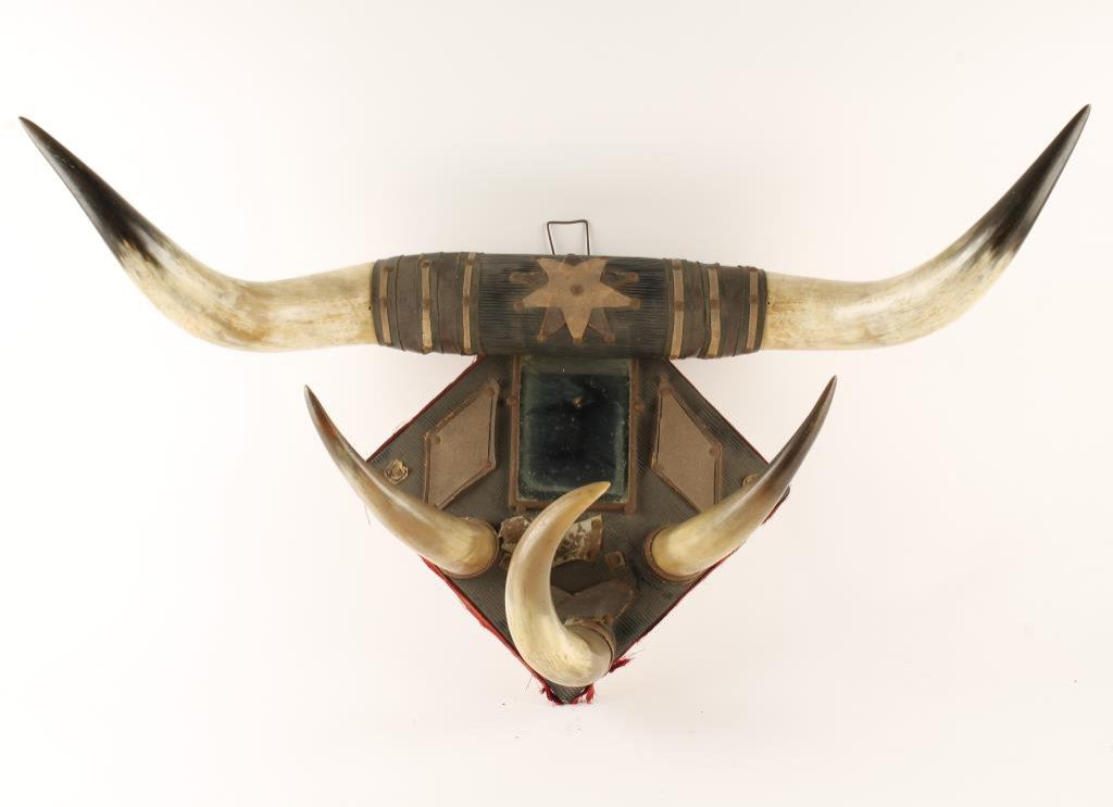 Steer horn coat and hat rack with mirror; set to be hung on a wall; backing brace is approx. 10” square with the header pair of horns having an approx. 30” spread. Est.: $100-$175.