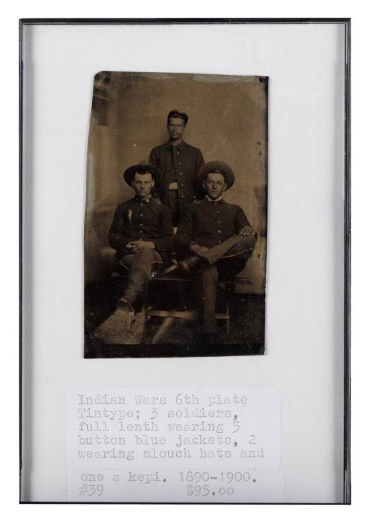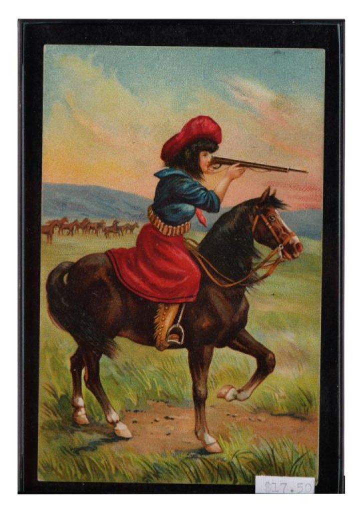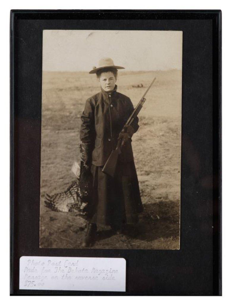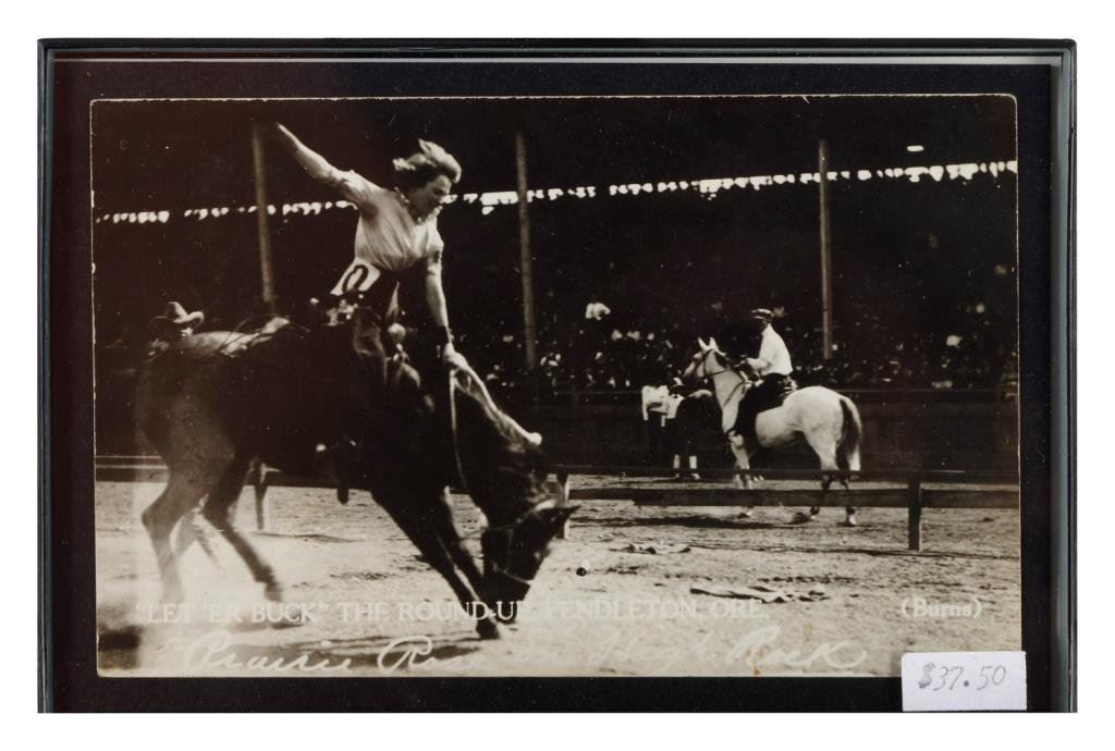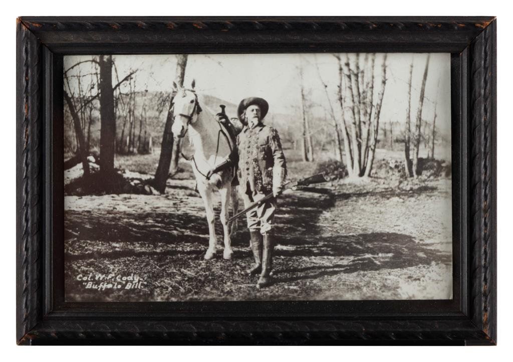 Bonanza lot of 10 separately framed Western and military photos and postcards including 5 postcards of cowgirls (one a photo postcard of “Prairie Rose” riding “High Rock” at the Pendleton Round-Up); one photo postcard of a woman hunter holding a Winchester Model 1897 shotgun and game bird; a cabinet photo of a soldier in uniform by Hardy of Boston; a photo postcard of 4 Western men, one showing his cartridge belt and holster; a 6th plate tintype of 3 Indian Wars era soldiers in uniform and a photo postcard of Buffalo Bill Cody with this horse, Winchester and buckskin outfit. Est.: $150-$300.