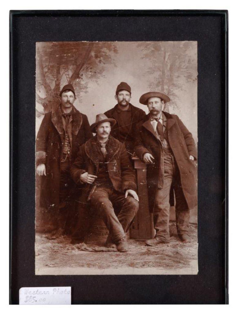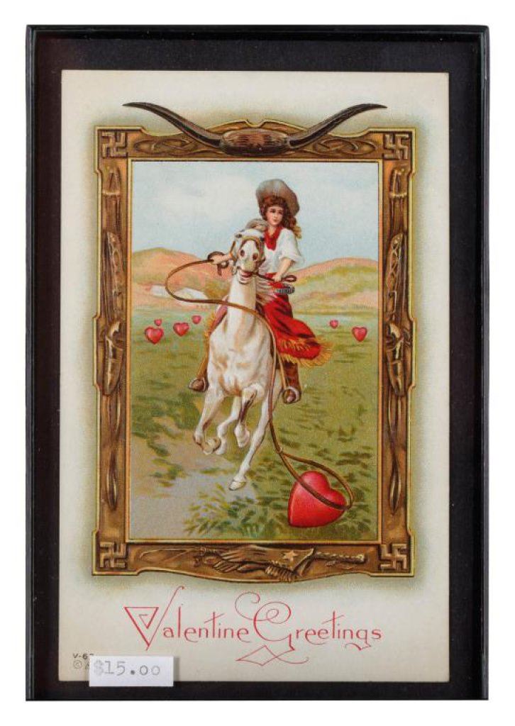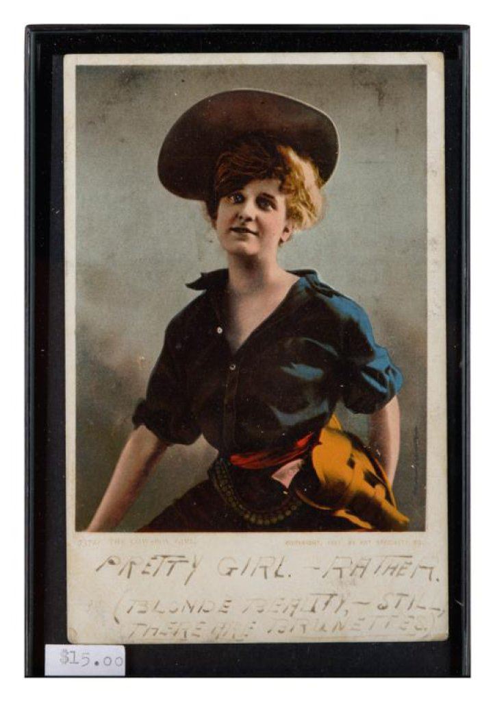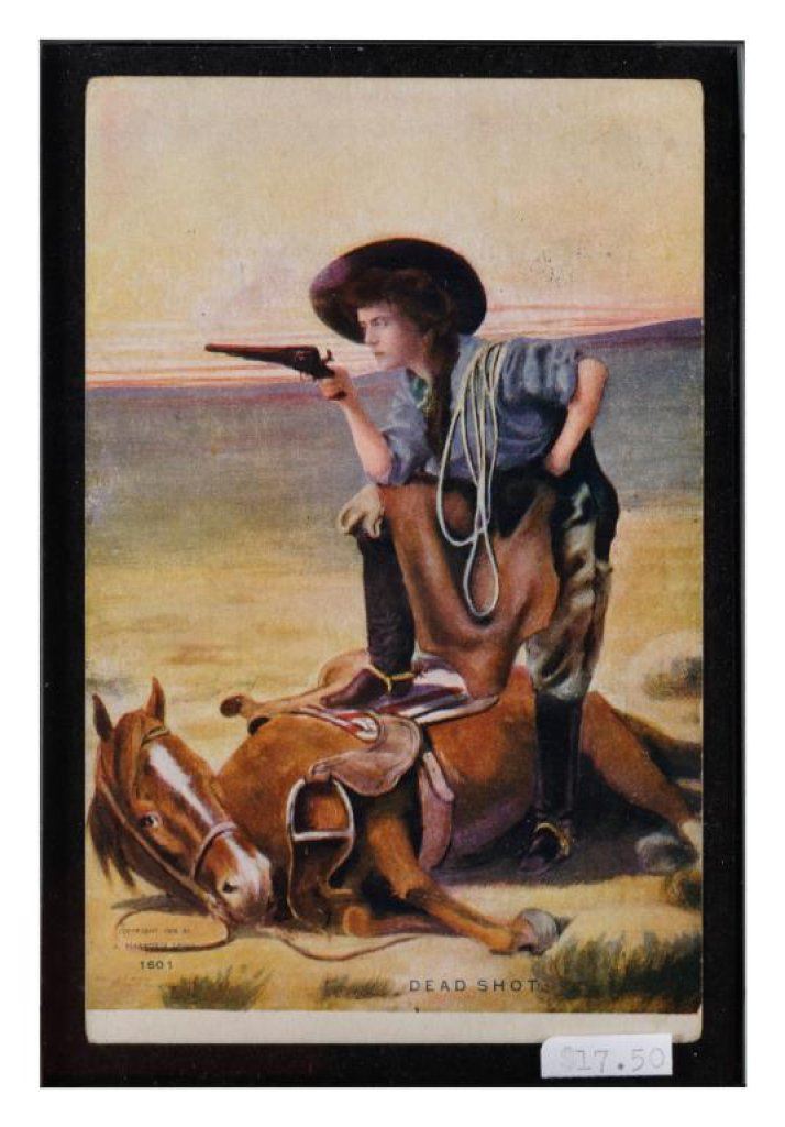 Bonanza lot of 10 separately framed Western and military photos and postcards including 5 postcards of cowgirls (one a photo postcard of “Prairie Rose” riding “High Rock” at the Pendleton Round-Up); one photo postcard of a woman hunter holding a Winchester Model 1897 shotgun and game bird; a cabinet photo of a soldier in uniform by Hardy of Boston; a photo postcard of 4 Western men, one showing his cartridge belt and holster; a 6th plate tintype of 3 Indian Wars era soldiers in uniform and a photo postcard of Buffalo Bill Cody with this horse, Winchester and buckskin outfit. Est.: $150-$300.