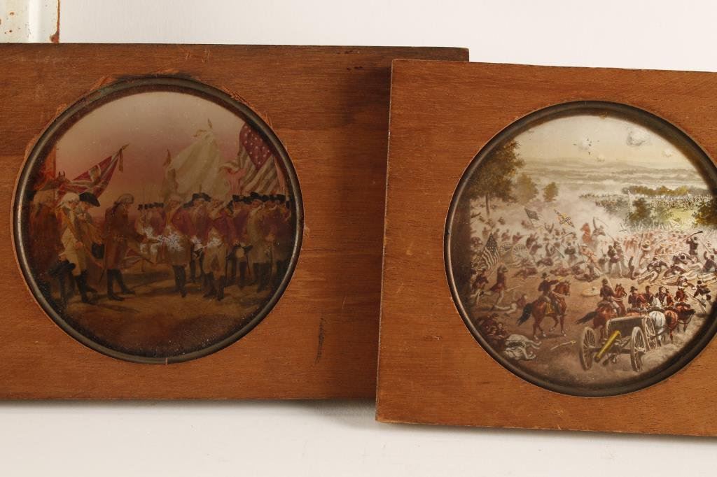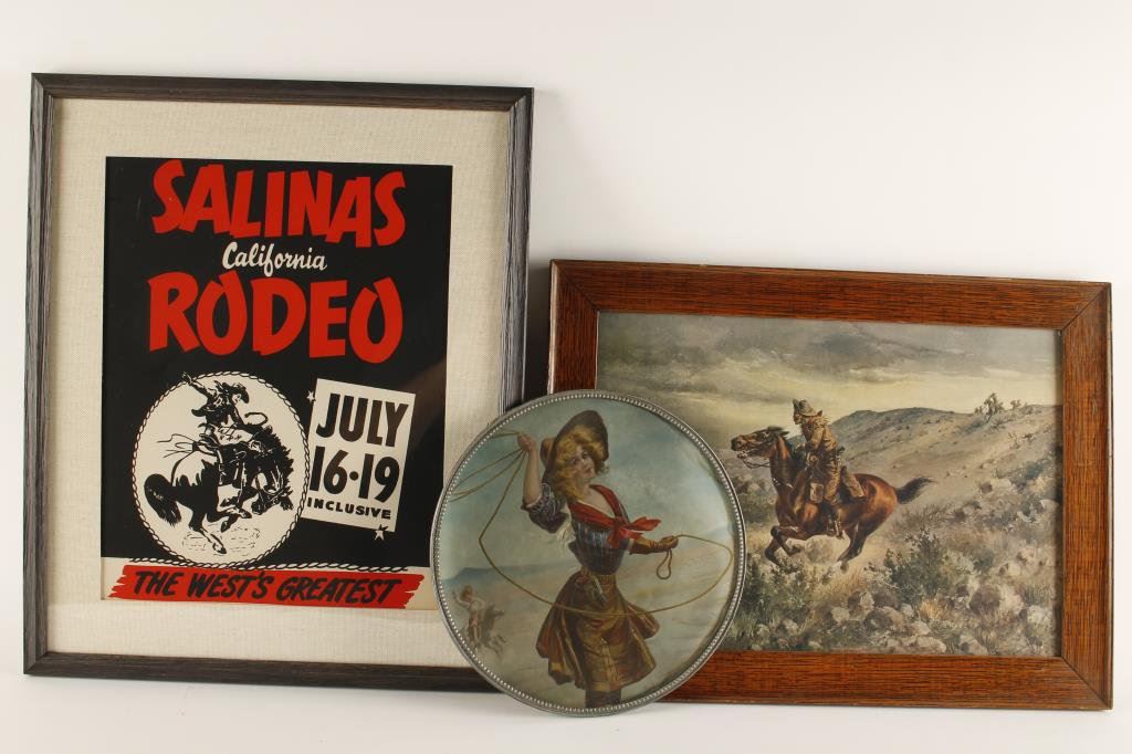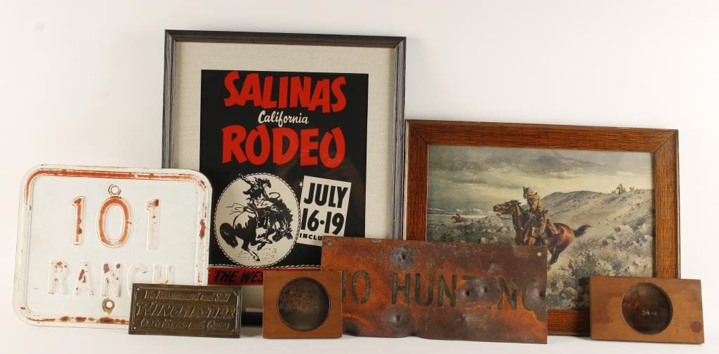Lot of misc. collectibles including 2 wood framed color glass images for an early viewing device, one of a battle scene of Gettsburg, the other of Geo. Washington accepting the surrender of the British during the American Revolution; also a color print in an oval frame approx. 10” in diameter depicting a cowgirl spinning a rope; a brass plaque advertising the sale of Winchester cartridges and guns, approx. 3” x 7”; a metal “NO HUNTING” sign that has experienced the wrath of previously frustrated hunters (approx. 6” x 14”); a metal 101 Ranch sign, approx. 10” x 12”; a framed old color print of a Pony Express rider being chased by Indians, approx. 13” x 18”; and a framed old poster advertising the Salinas, California Rodeo, approx. 18” x 15” overall. Est.: $200-$300.