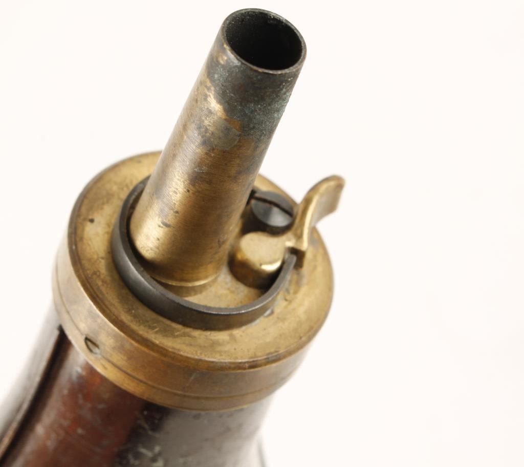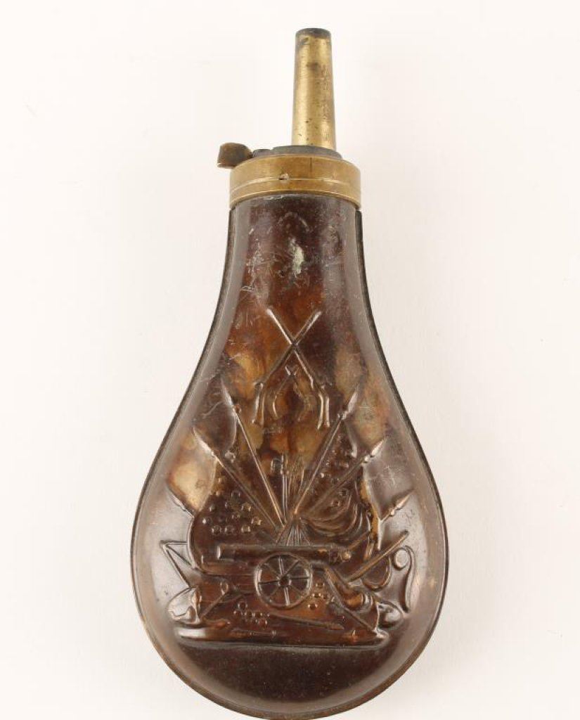 Italian made reproduction of a brass powder flask with embossed stand-of-flags, cannon and crossed weapons on one side; overall very good condition. Est.: $25-$50.