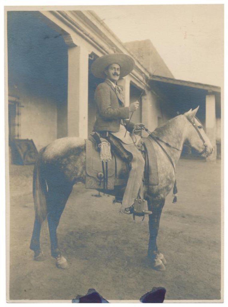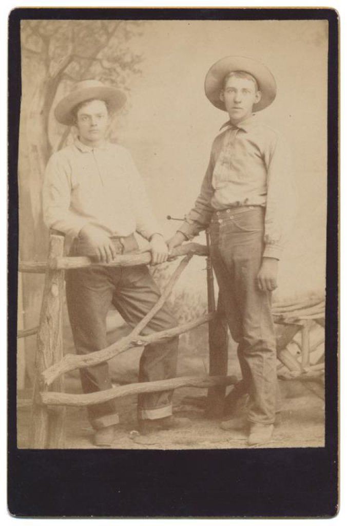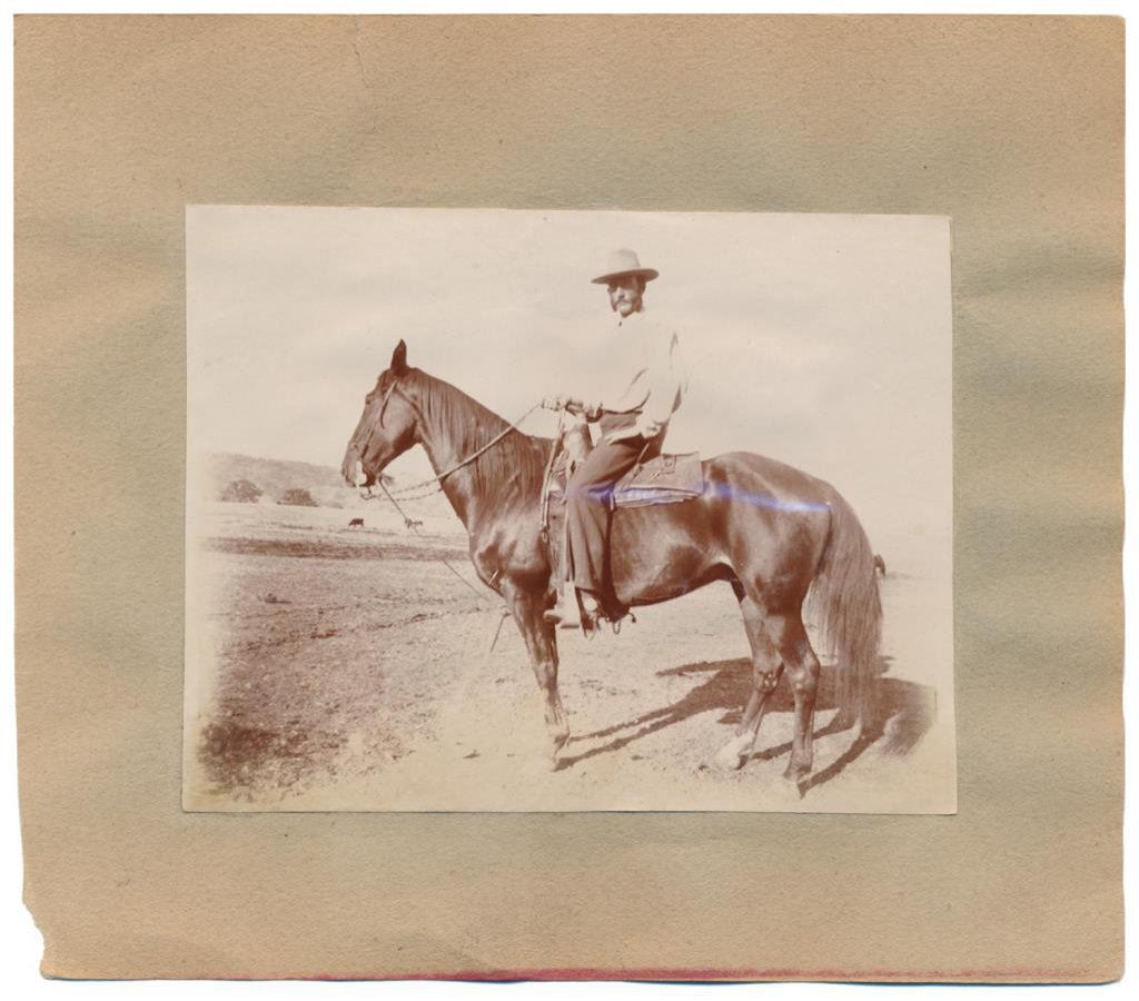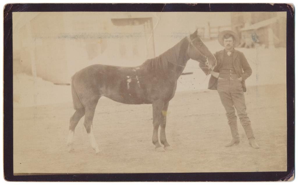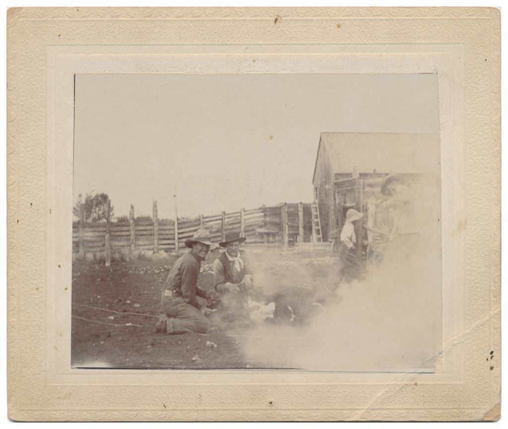 Lot of 7 old Western photos, cabinet cards and an old color advertiser for Aromatic Cheroots. The photos include classic subject matter: cowboys on horses, branding scenes, posed photos of men and a little child, etc. Est.: $100-$175.