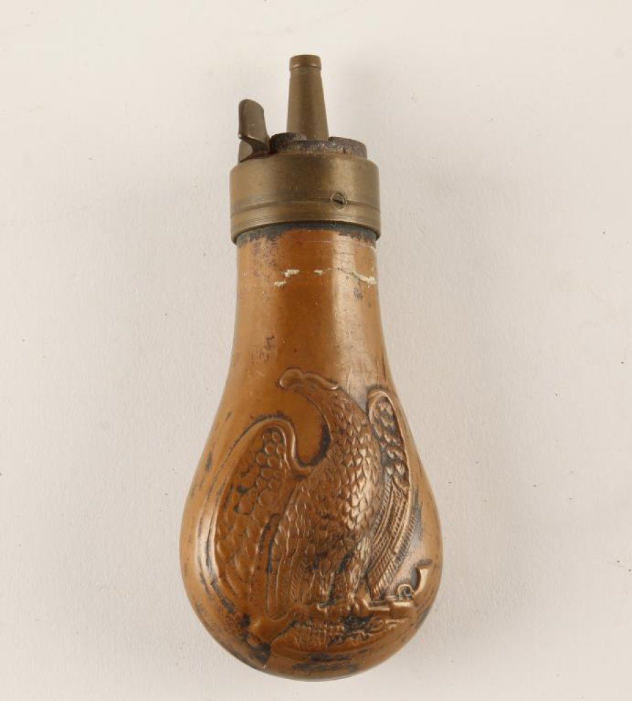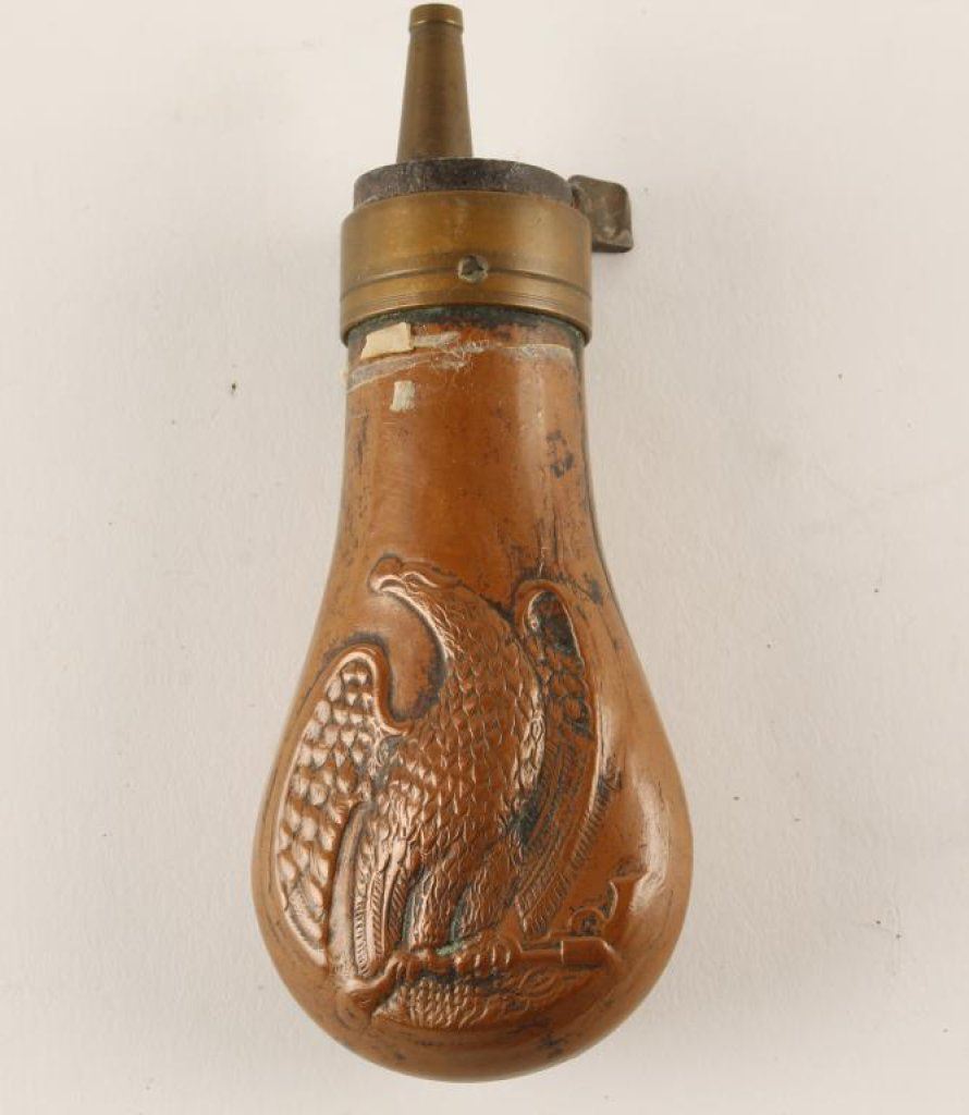 Brass powder flask with embossed spread eagle on both sides; approx. 4-1/2” overall and for a percussion pocket model revolver. The condition of this piece is good to very good with a pleasing patina and good seams. Est.: $125-$250.