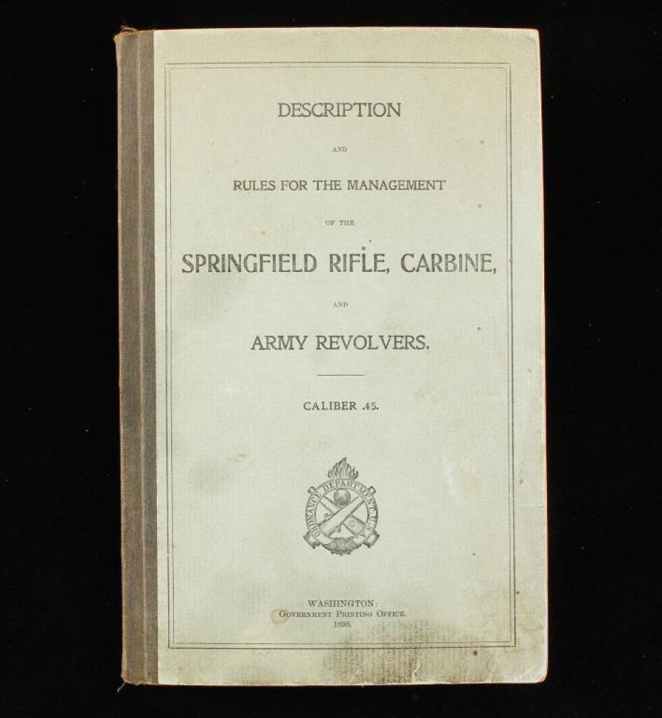 Original U.S. Ordinance Dept. Description and Rules for the Management of the Springfield rifle, carbine and Army revolvers, Caliber .45 manual; Gov’t Printing Office, 1898; overall good condition; some light soiling to cover; great detail and fold-outs. Est.: $150-$250.
