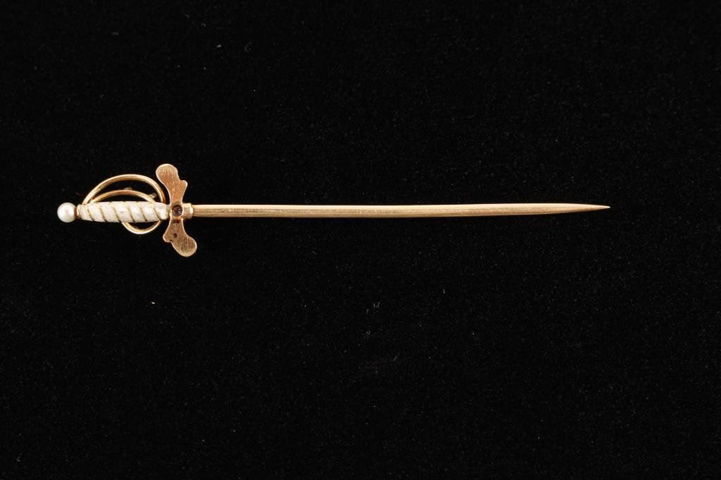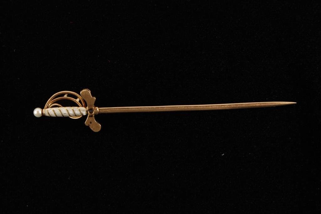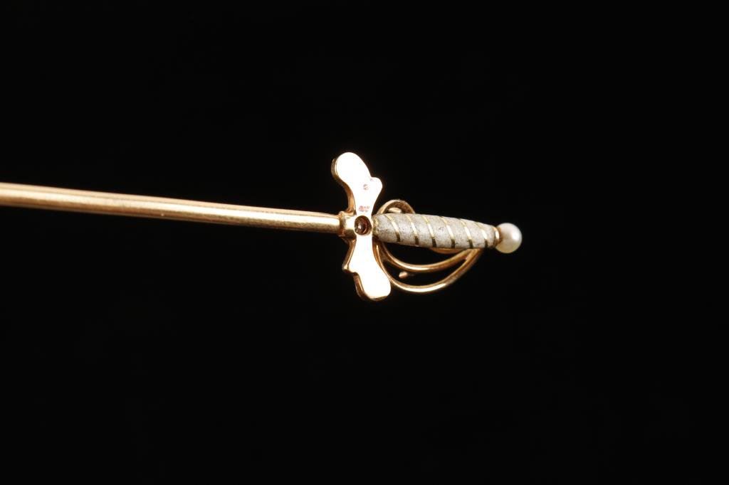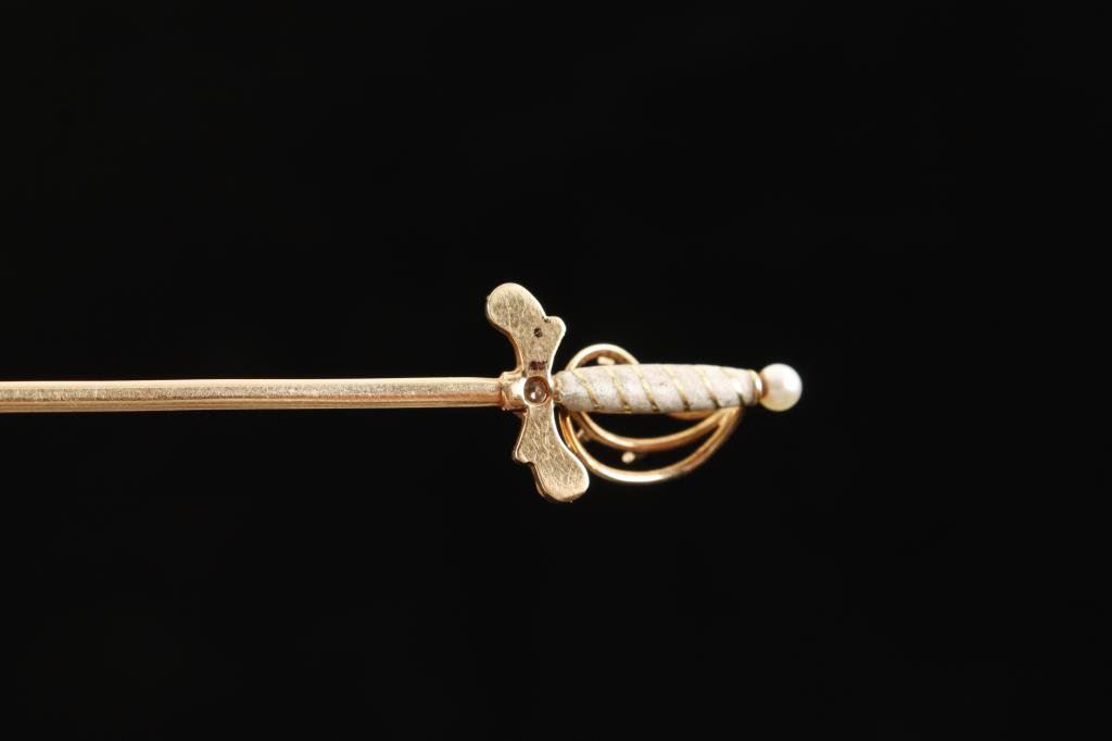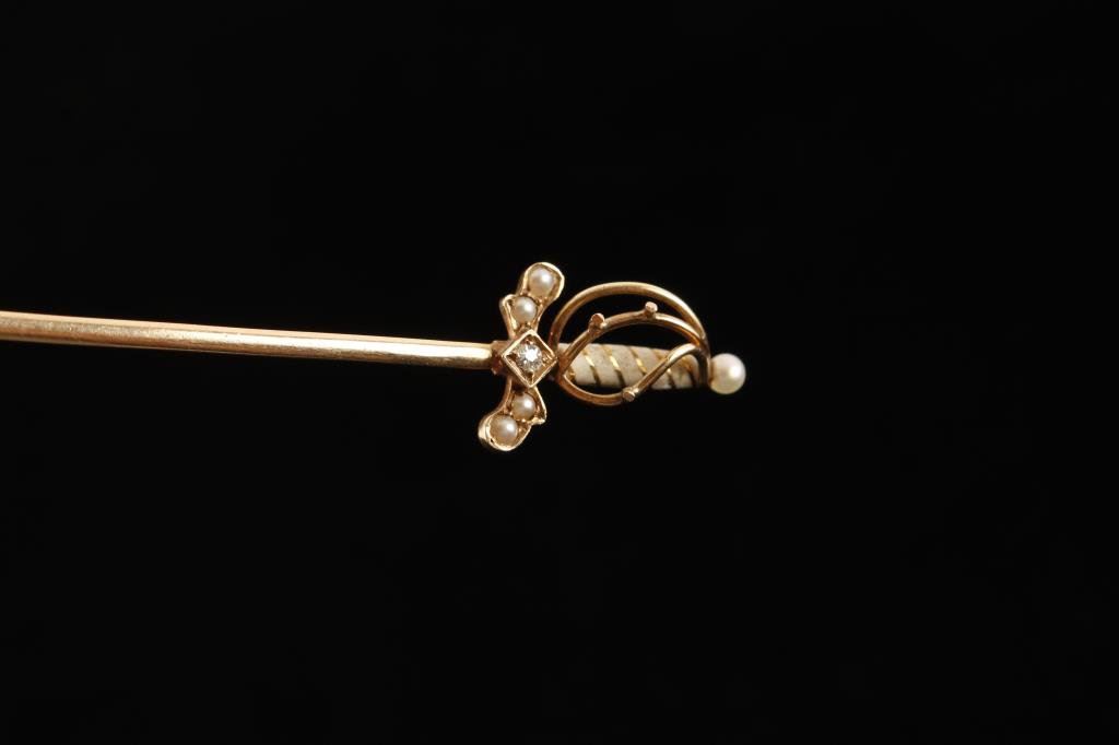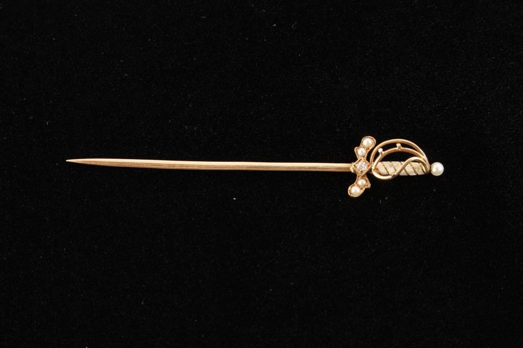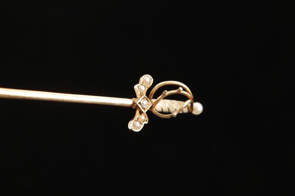 Lot 51a Antique sword pin mounted with pearls and white stone in rose gold. Great