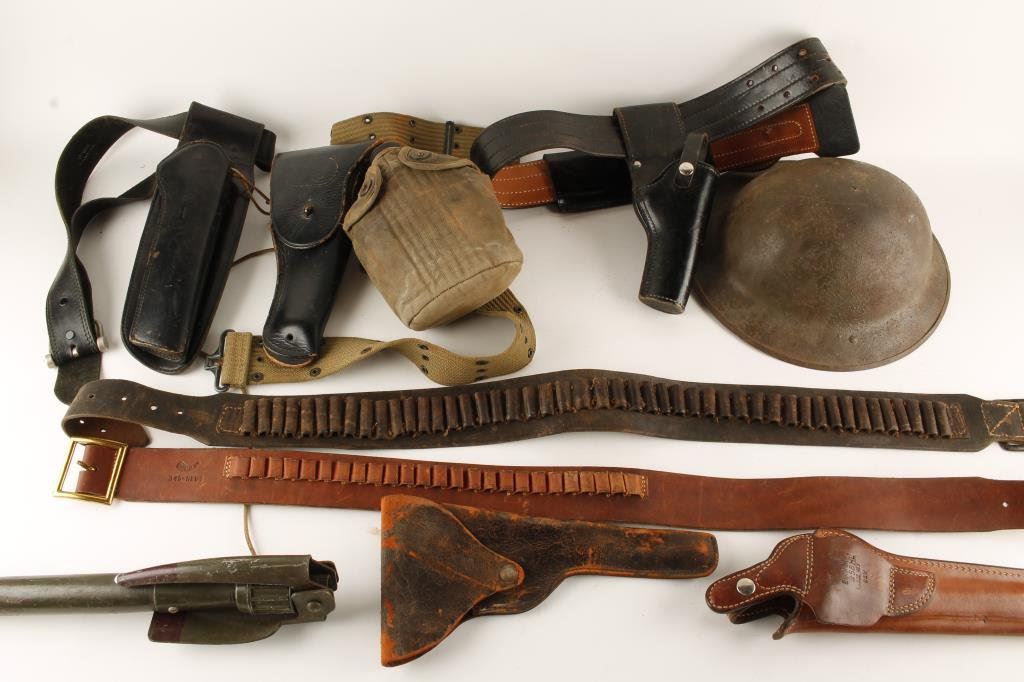 Bonanza collector’s lot including misc. U.S. military belts, pouches, 2 canteens with “US” covers, etc.; also 3 misc. cartridge belts and a belt with brass S&W buckle; Un-marked black leather holster and belt; military entrenching tool and a WW I “doughboy” helmet. Est.: $250-$500.