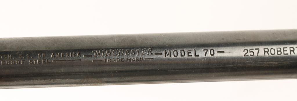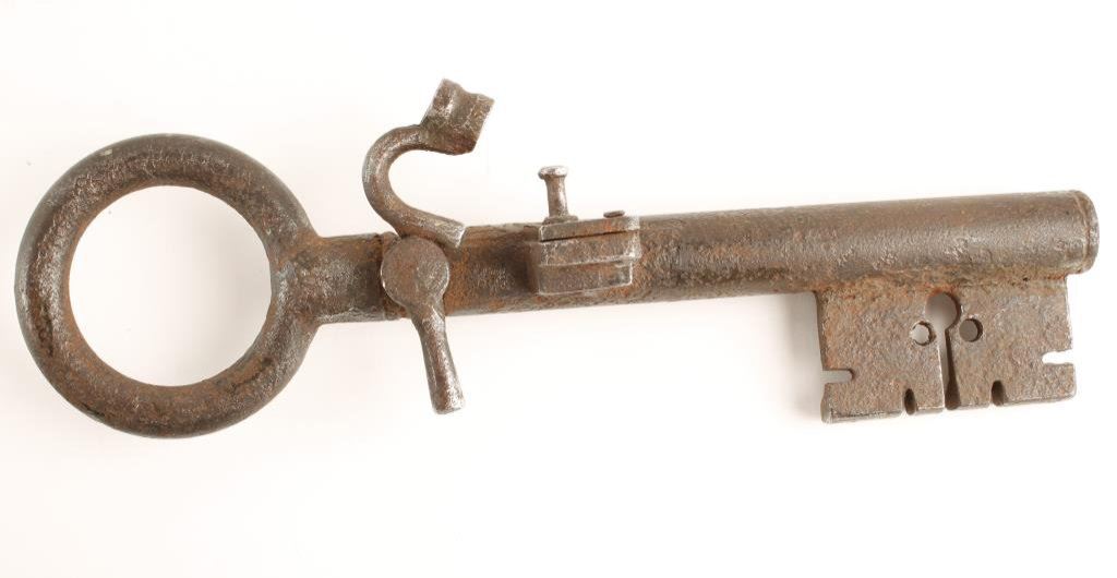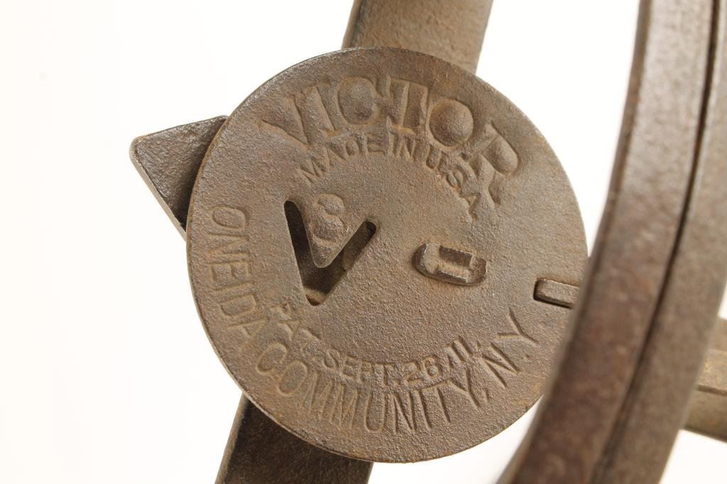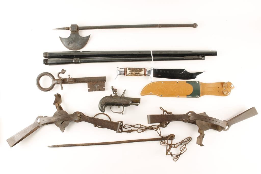 Bonanza collector’s lot including a 19th to 20th Century copy of a matchlock key gun, approximately 10” long; 2 Victor brand #3 iron animal traps; an old iron axe with hidden spear point dagger and decorated axe head, approximately 22” overall; non-gun model of a flintlock pistol with built-in stand, approximately 6” long; large modern German-made Bowie knife with stag grip, approximately 13.5” overall with an 8.25” blade and accompanied by a leather sheath, both in excellent condition and two rifle barrels; one is a re-blued Winchester 26” octagon barrel in .45-90 caliber with rough bore; the other is a Winchester Model 70 24” round barrel in .257 Roberts caliber with a very good bore. Est.: $375-$750.