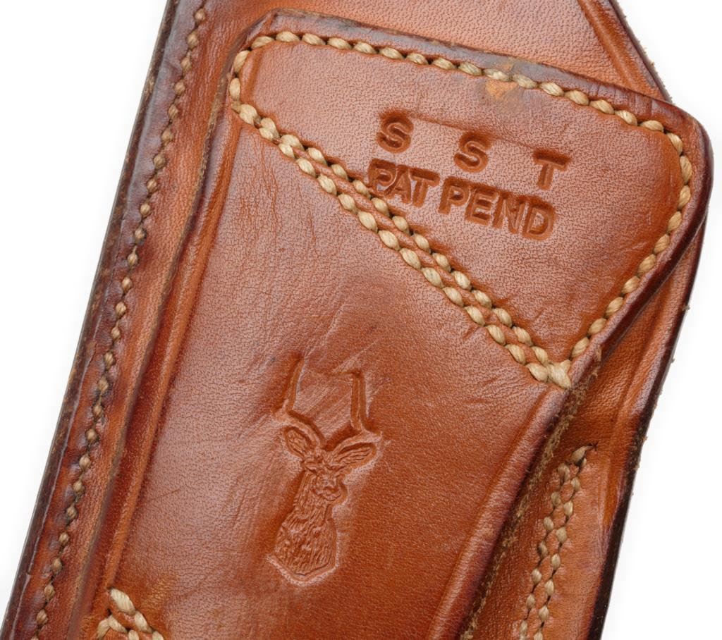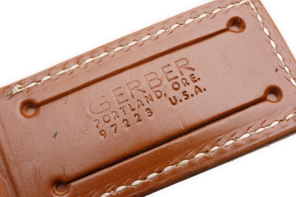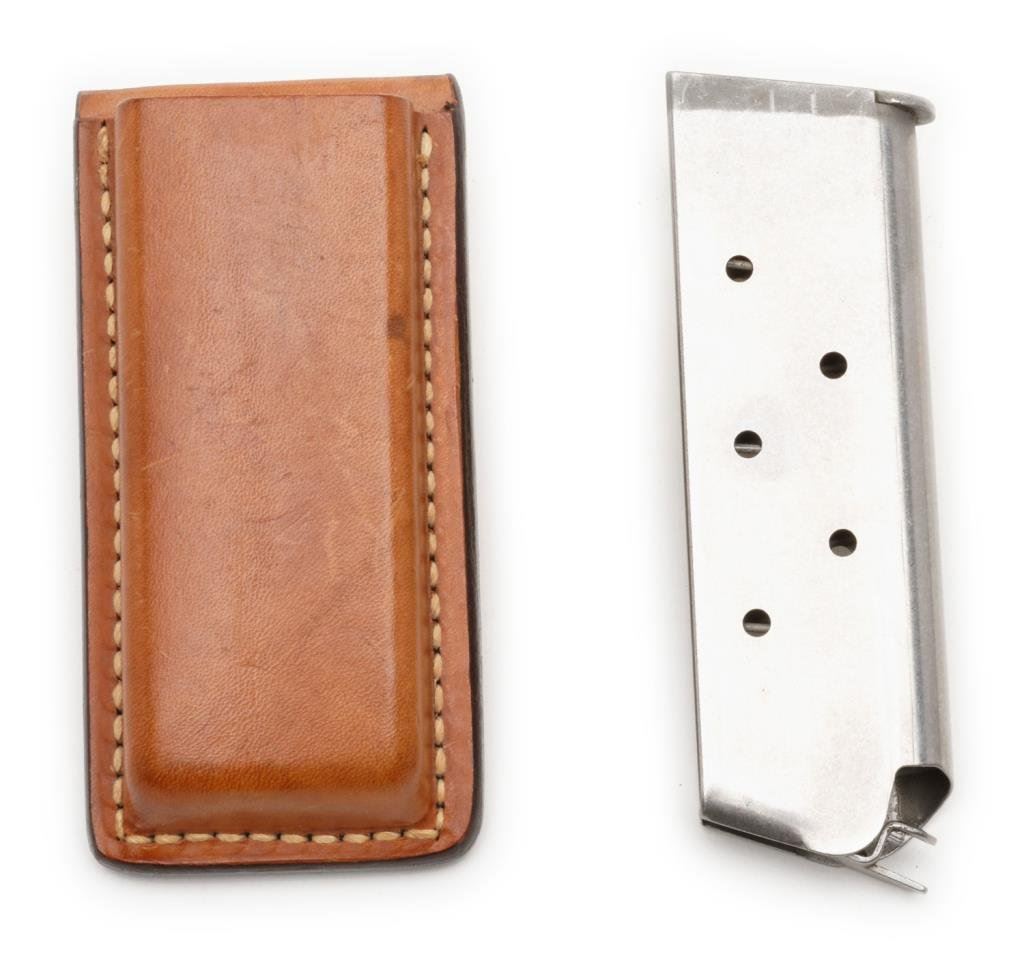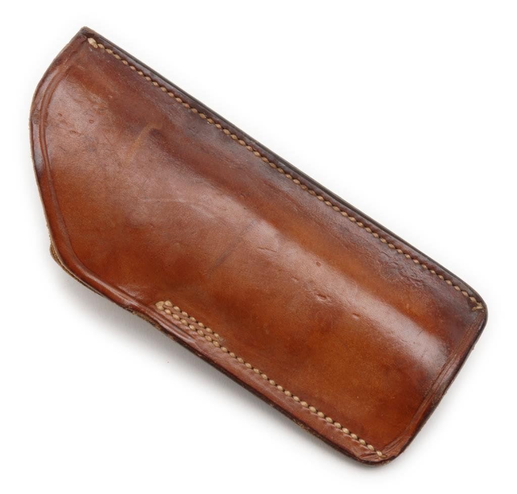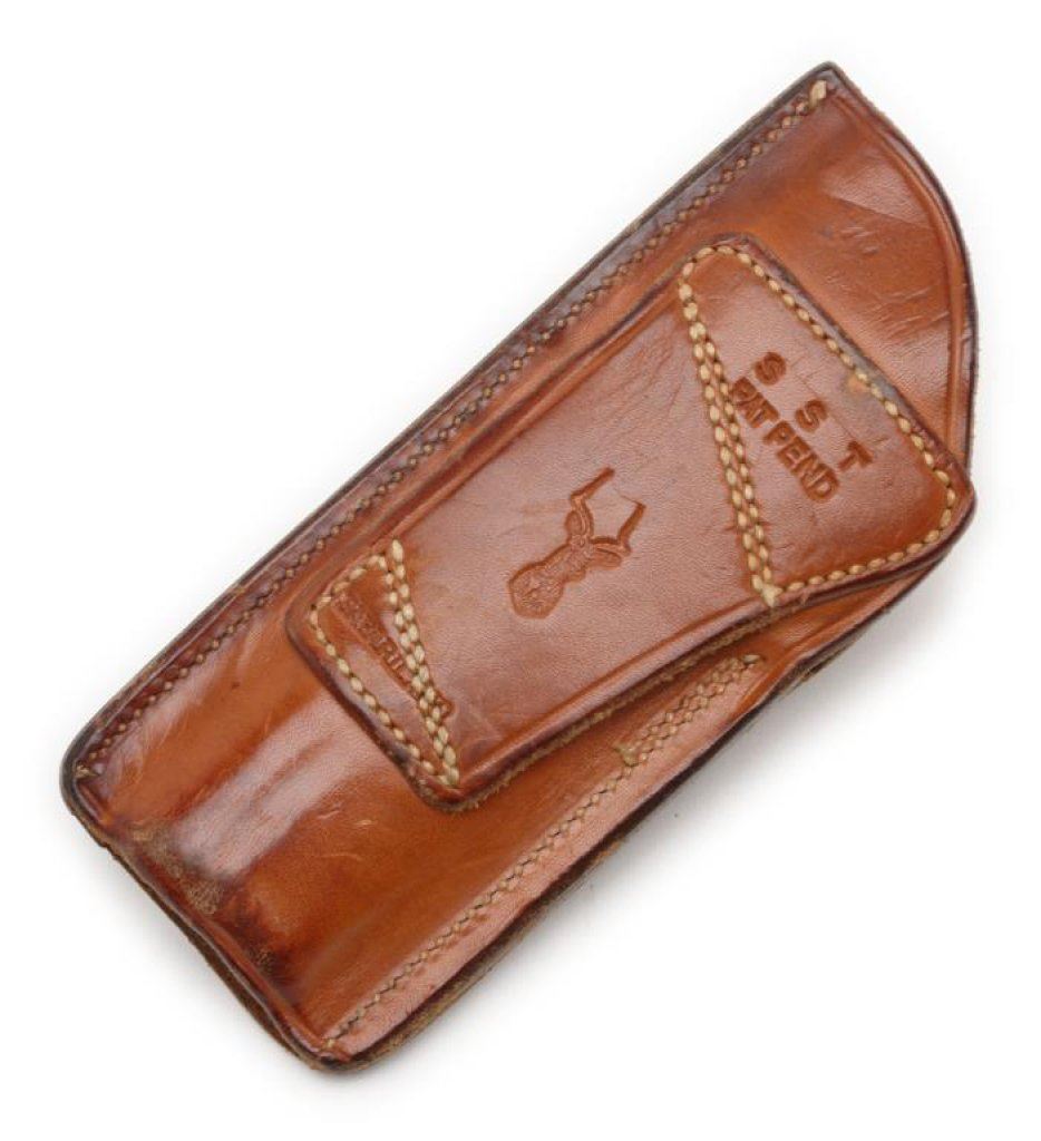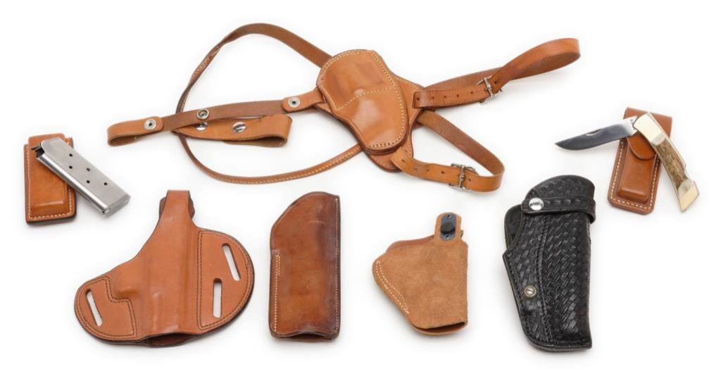 Misc. lot of leather including 5 leather holsters, a clip on leather single magazine holder with Colt .45 caliber magazine and a leather sheath and Gerber folding knife with stag grips in like new condition. Est.: $100-$150.