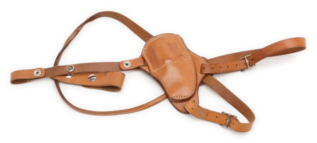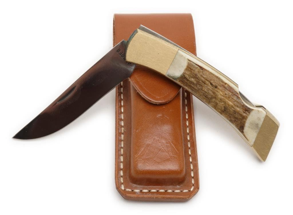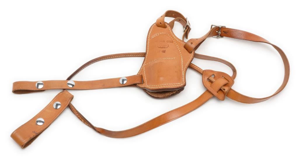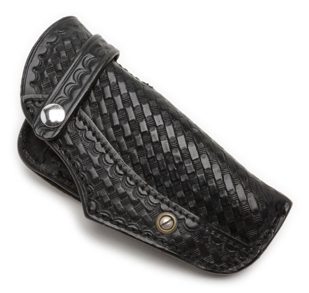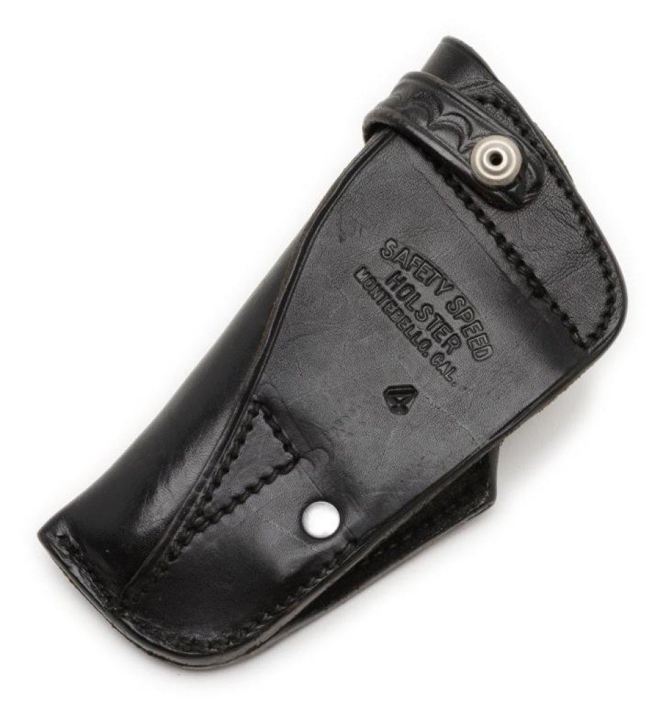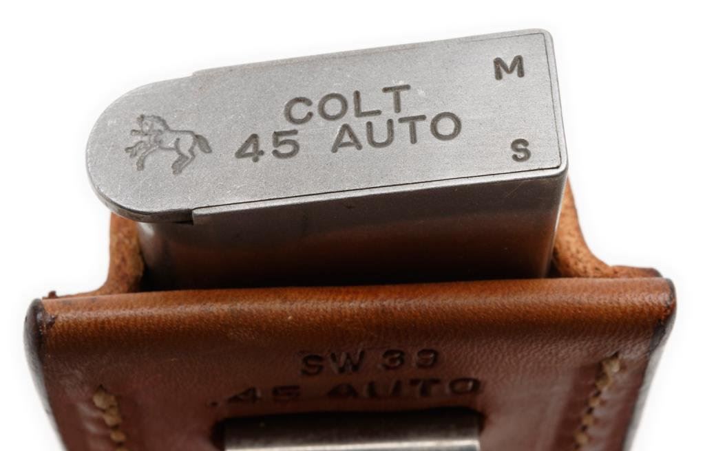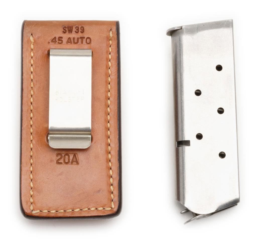Misc. lot of leather including 5 leather holsters, a clip on leather single magazine holder with Colt .45 caliber magazine and a leather sheath and Gerber folding knife with stag grips in like new condition. Est.: $100-$150.