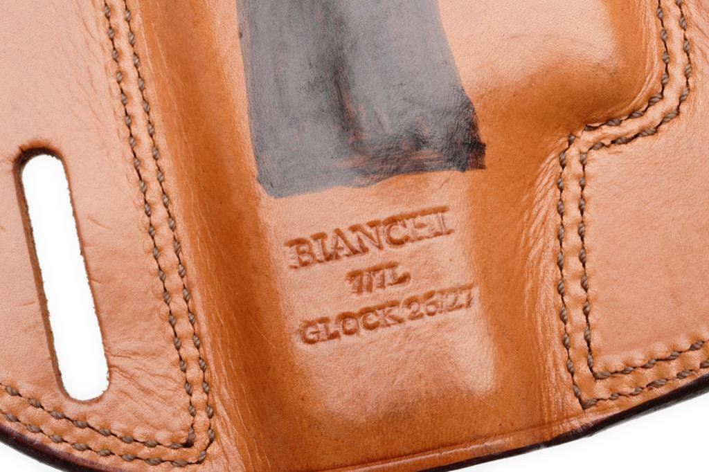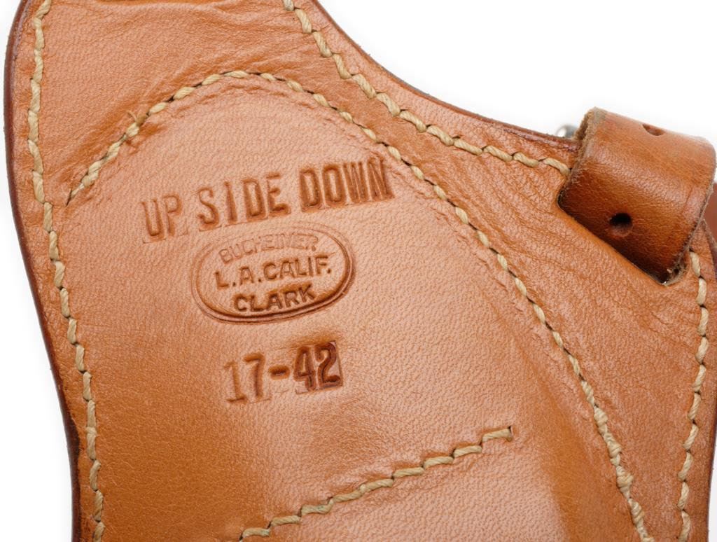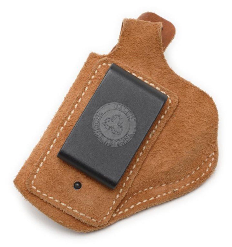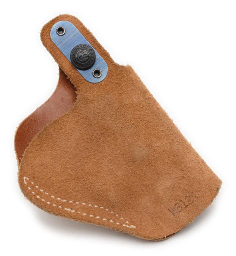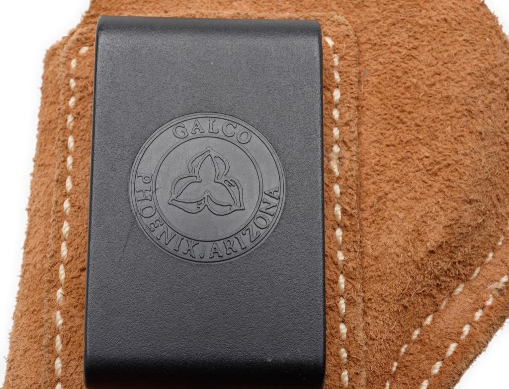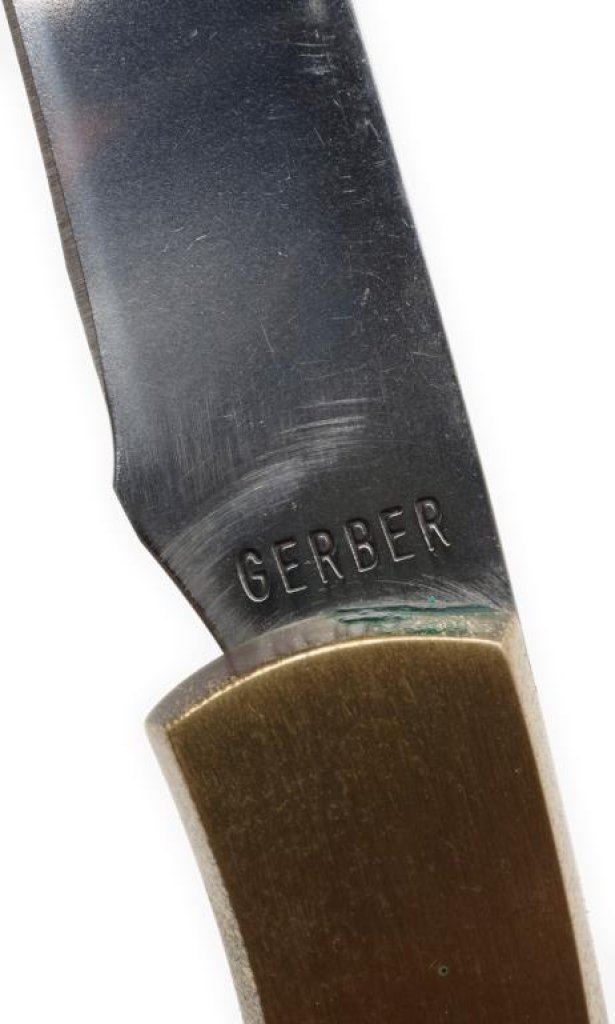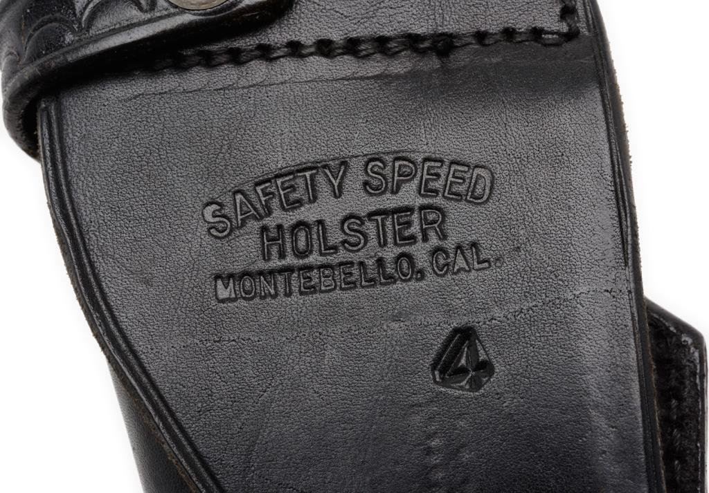 Misc. lot of leather including 5 leather holsters, a clip on leather single magazine holder with Colt .45 caliber magazine and a leather sheath and Gerber folding knife with stag grips in like new condition. Est.: $100-$150.
