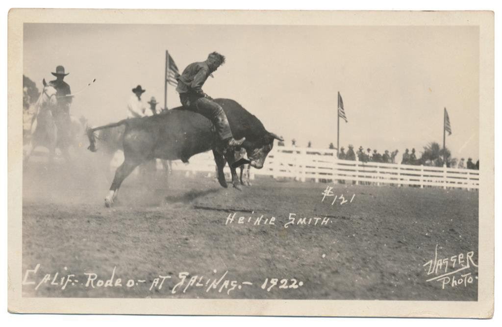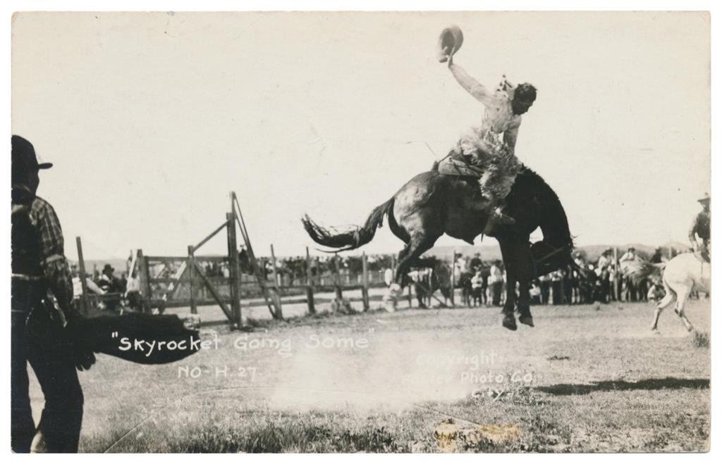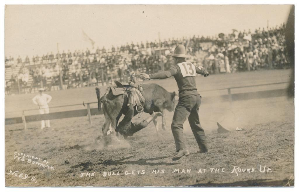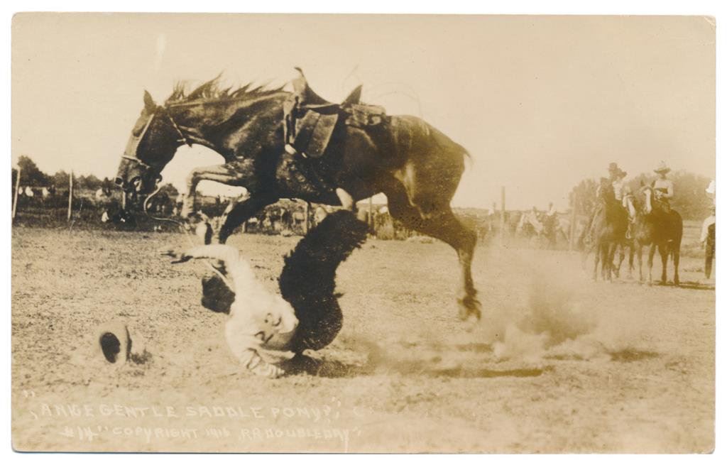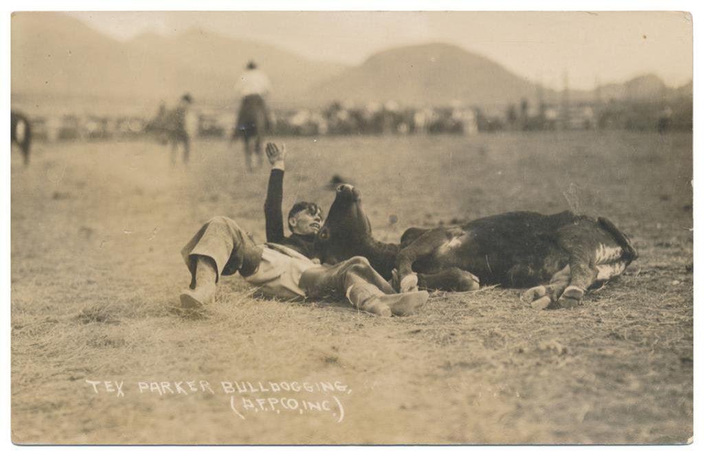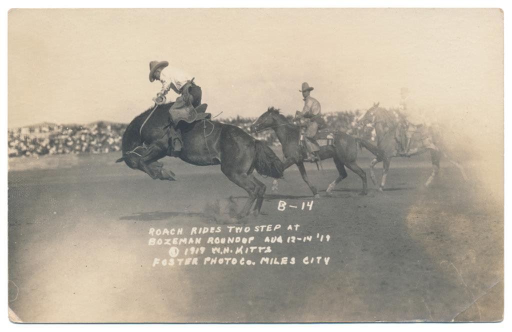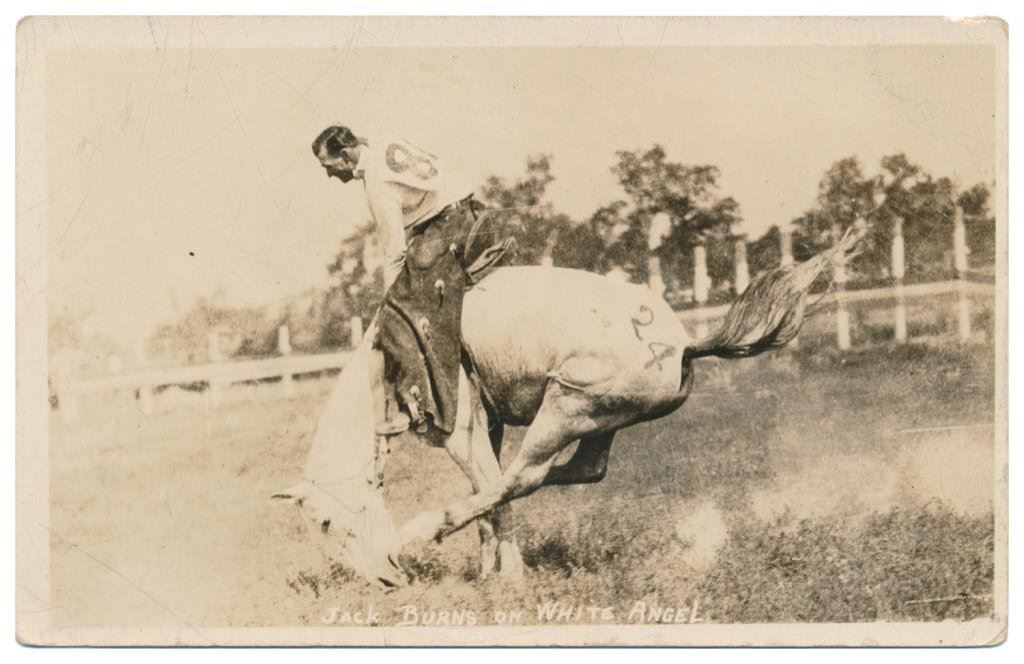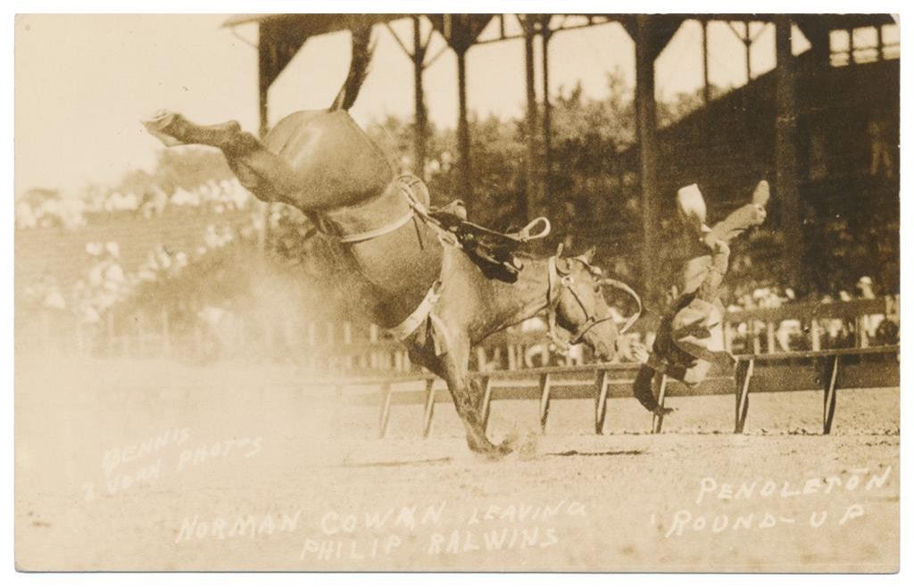 Lot of 20 photo postcards and a paper disc from the 1914 Walla Walla, WA Frontier Days. The postcards relate primarily to Rodeos of the early 1900’s including scenes at Pendleton, OR; Deming, NM; Tucson, AZ; Bozeman, MT; Salinas, CA; Trinidad, CO, etc. and featuring such early riding greats as Paul Jones, Tex Crockett, Heinie Smith, Jack Burns, Lee Ross, Bob Anderson and Tex Parker. Est.: $150-$300.