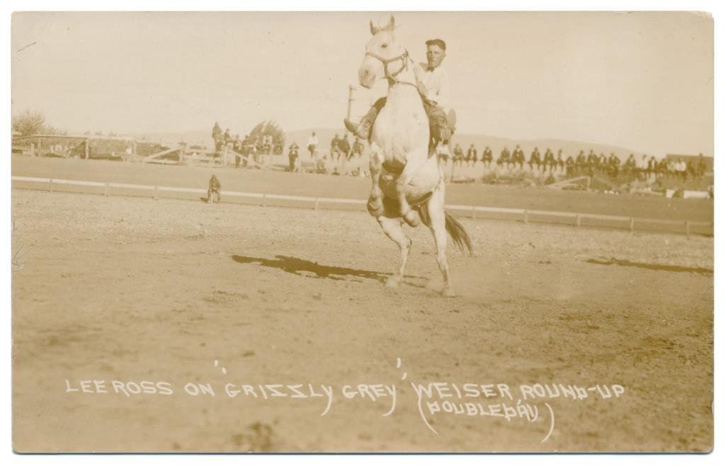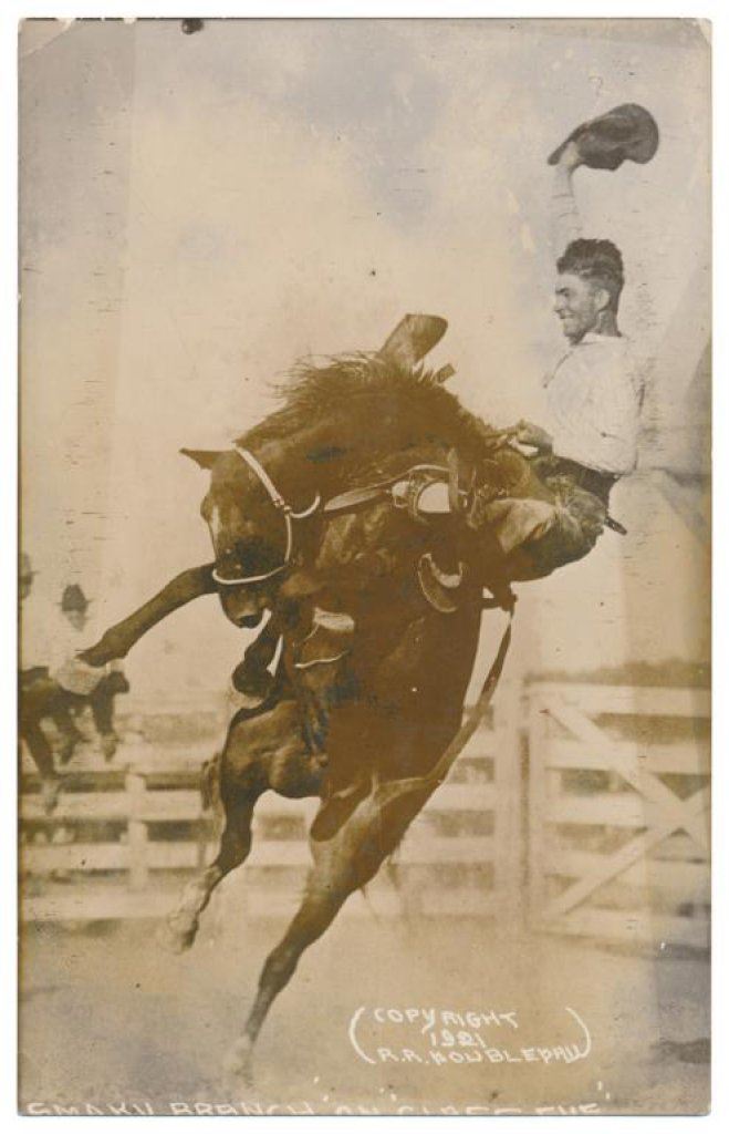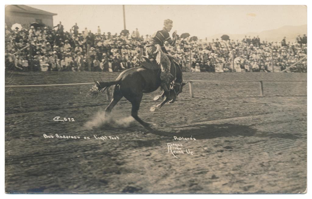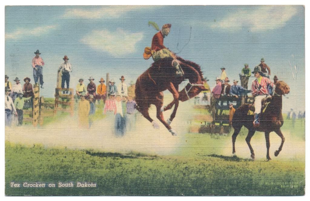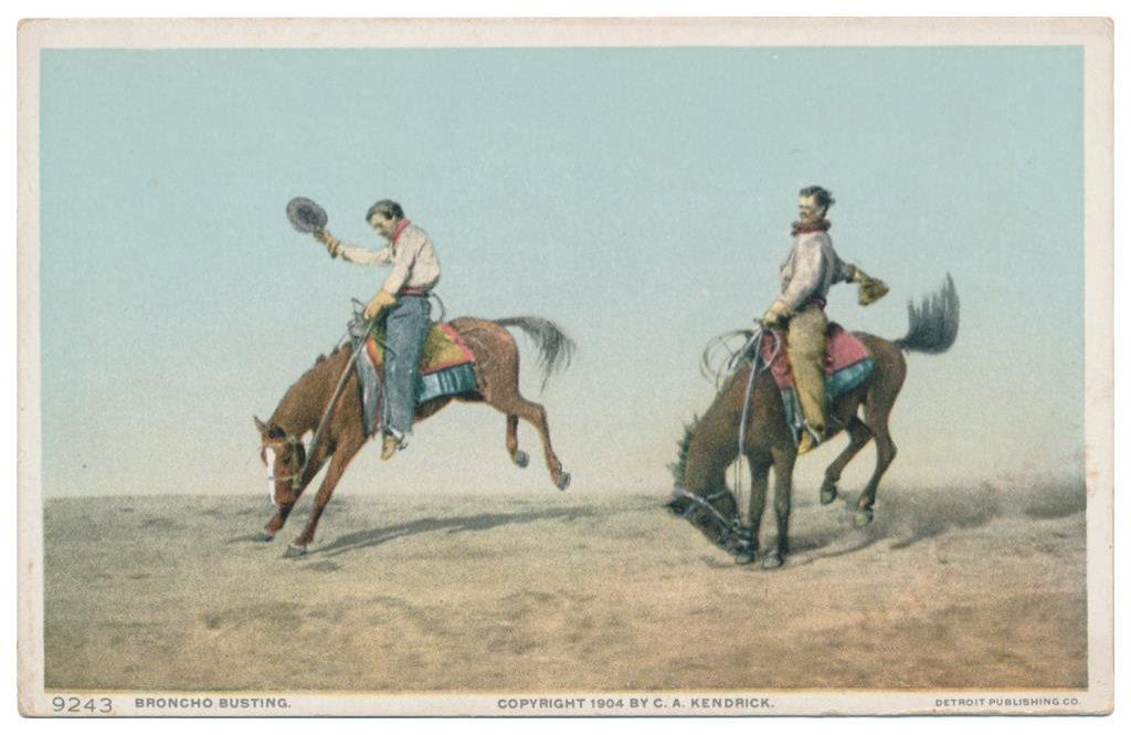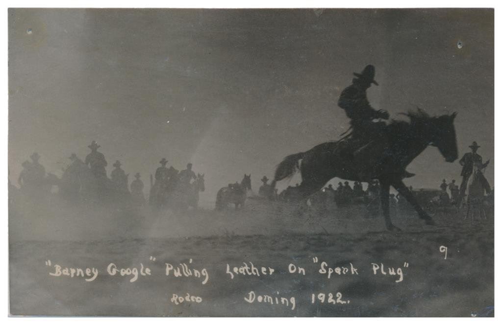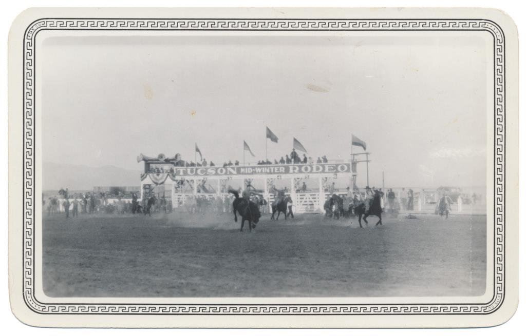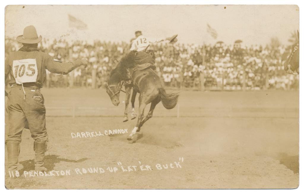 Lot of 20 photo postcards and a paper disc from the 1914 Walla Walla, WA Frontier Days. The postcards relate primarily to Rodeos of the early 1900’s including scenes at Pendleton, OR; Deming, NM; Tucson, AZ; Bozeman, MT; Salinas, CA; Trinidad, CO, etc. and featuring such early riding greats as Paul Jones, Tex Crockett, Heinie Smith, Jack Burns, Lee Ross, Bob Anderson and Tex Parker. Est.: $150-$300.