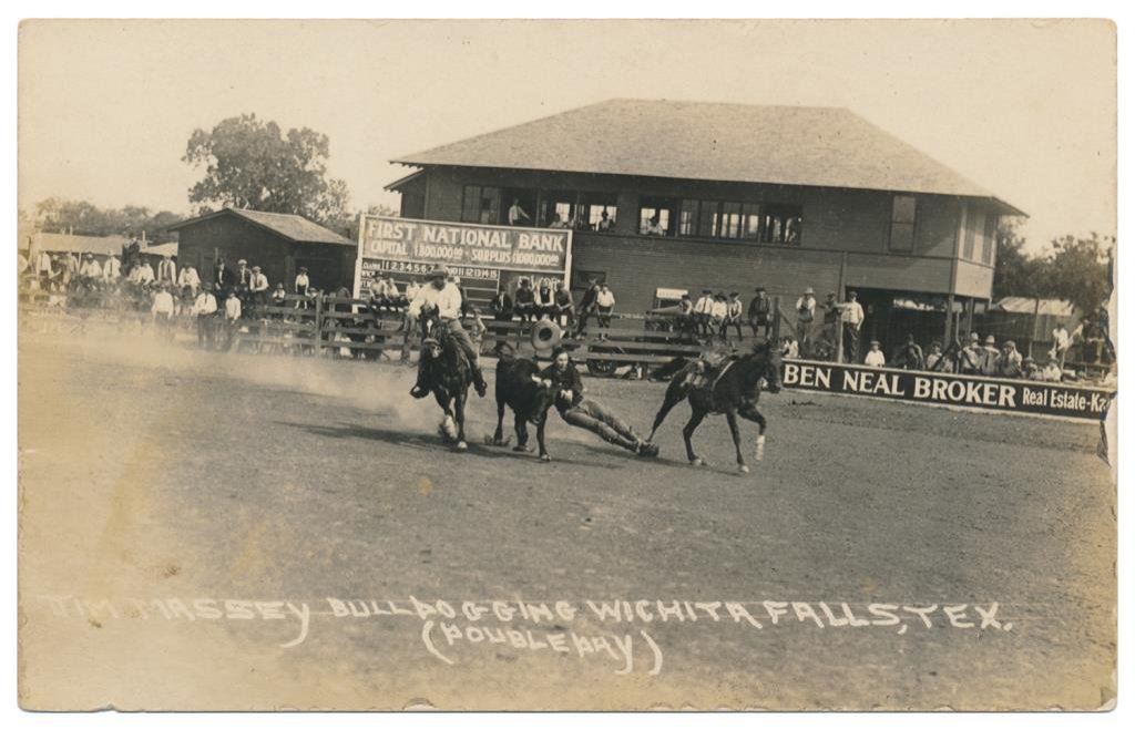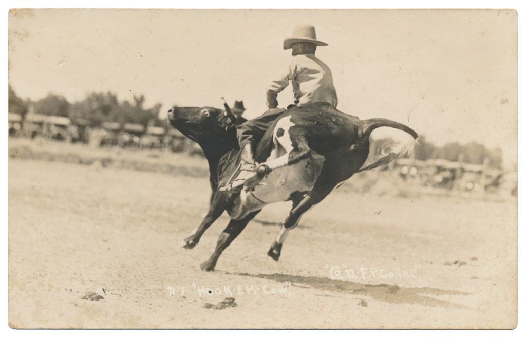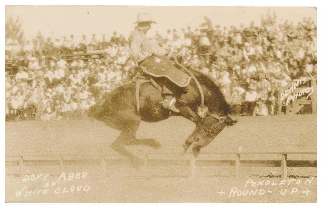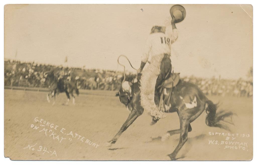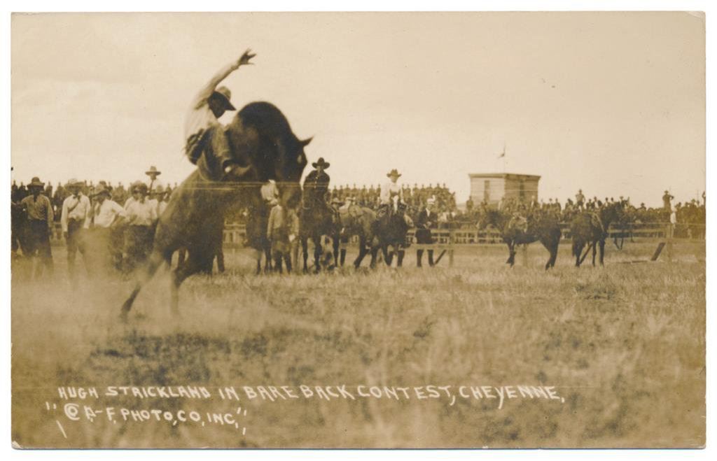 Lot of 21 great early postcard photos of Rodeo events, most identified, from the early 1900’s showing bronco and trick riding, bull riding, bull dogging, etc. at such locations as the Miles City Round-up, Pendleton Round-up, Wichita Falls, TX., Lewiston Round-up, Cheyenne Round-up, Salinas Round-up, etc. Also featuring legendary Rodeo performers Tex Mc Cleod, George E. Attebury, Mike Steuart, Walter Bonifer, Roy Adams, Leonard Stroud, Hugh Strickland and Bugger Red Jr. Est.: $150-$300.