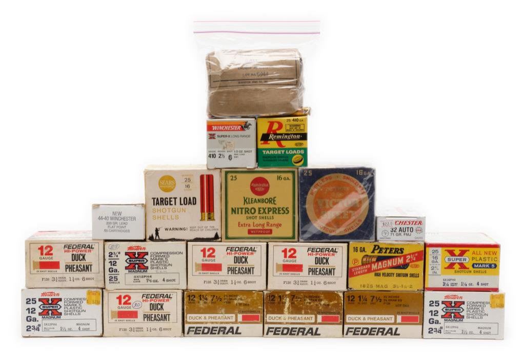 Lot of 17 boxes of shotgun shells,2 boxes of handgun ammo (.45 auto caliber and .32 auto) and a box of .44-40 ammo. The boxes of shotgun shells range from .410 gauge to 12 & 16 gauge. Most appear full and there are several older collector boxes. Est.: $75-$125.