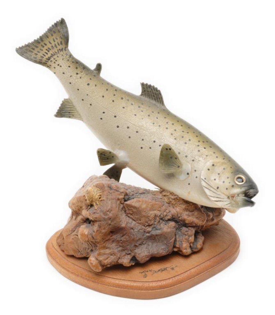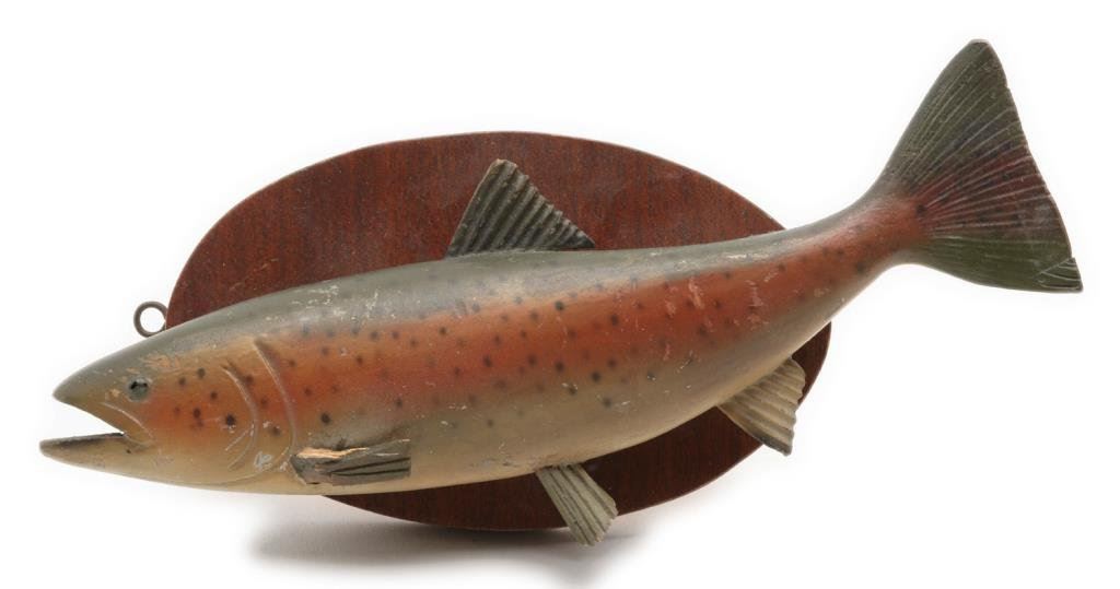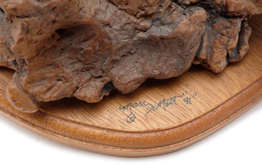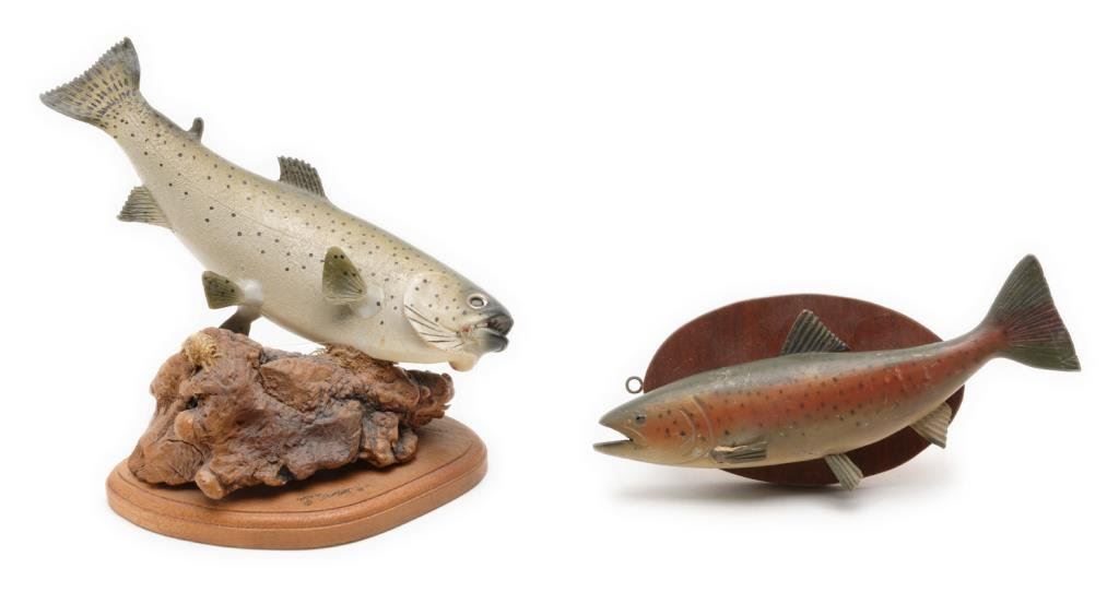 Lot consisting of a finely carved and painted trout mounted on a burl piece of wood and a display base that is signed “Marc DeMott, ‘91”, approx. 12” x 8”; also a carved and painted wood rainbow trout on a wood plaque, approx. 10-1/2” x 4” with slight damage to one fin. Est.: $50-$100.
