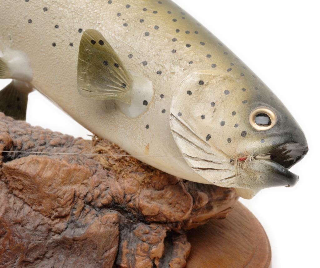 Lot 71 Lot consisting of a finely carved and painted trout mounted on a burl piec