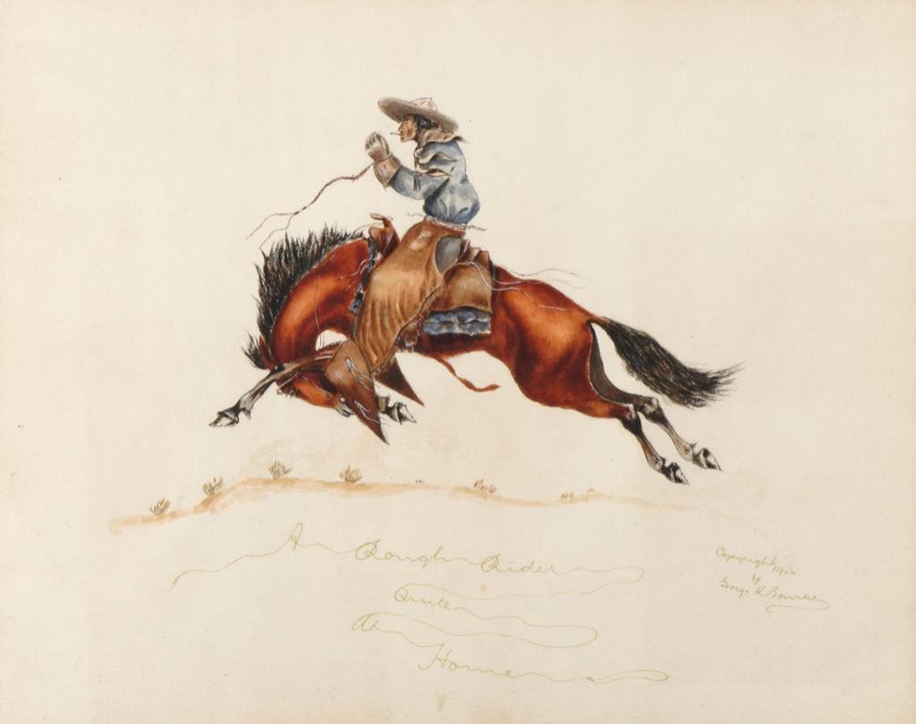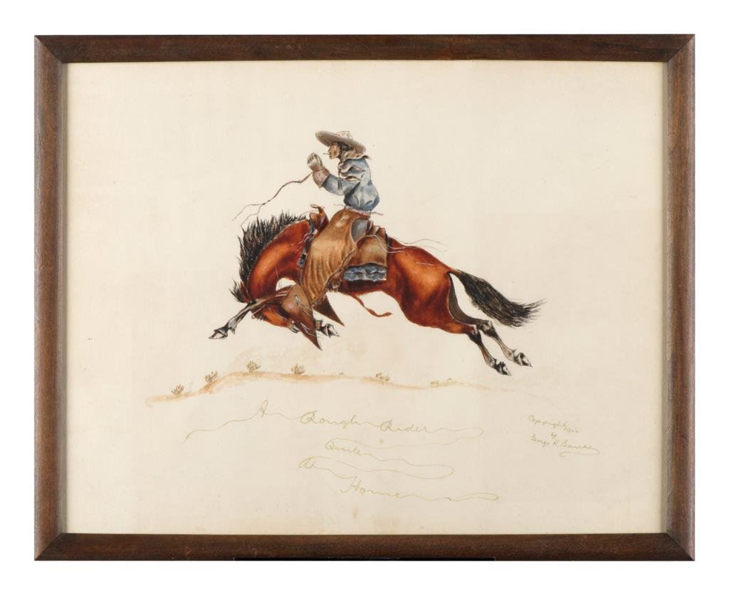 Framed original watercolor by George K. Bourke (1858-1930) entitled “A Rough Rider Quite at Home”, approx. 12” x 15” and finely accomplished; dated 1900. Est.: $300-$500