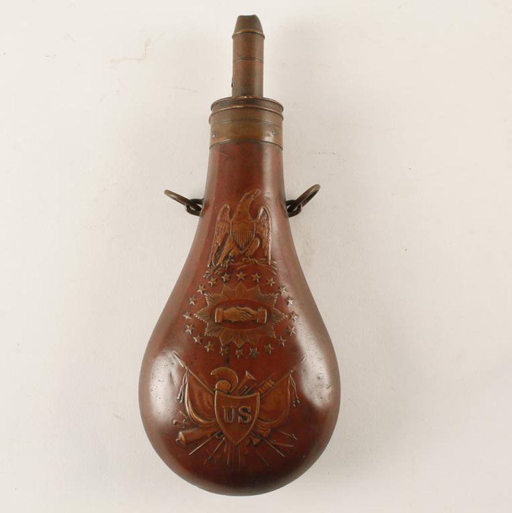 Large US Batty marked brass Peace flask dated 1853; approx. 10” overall with spread eagle and shaking hands; graduated spout with an old ding to the tip of the spout; both hang rings remaining and the condition of the flask is overall good to very good showing a deep patina from age and tight seams. Est.: $200-$300.