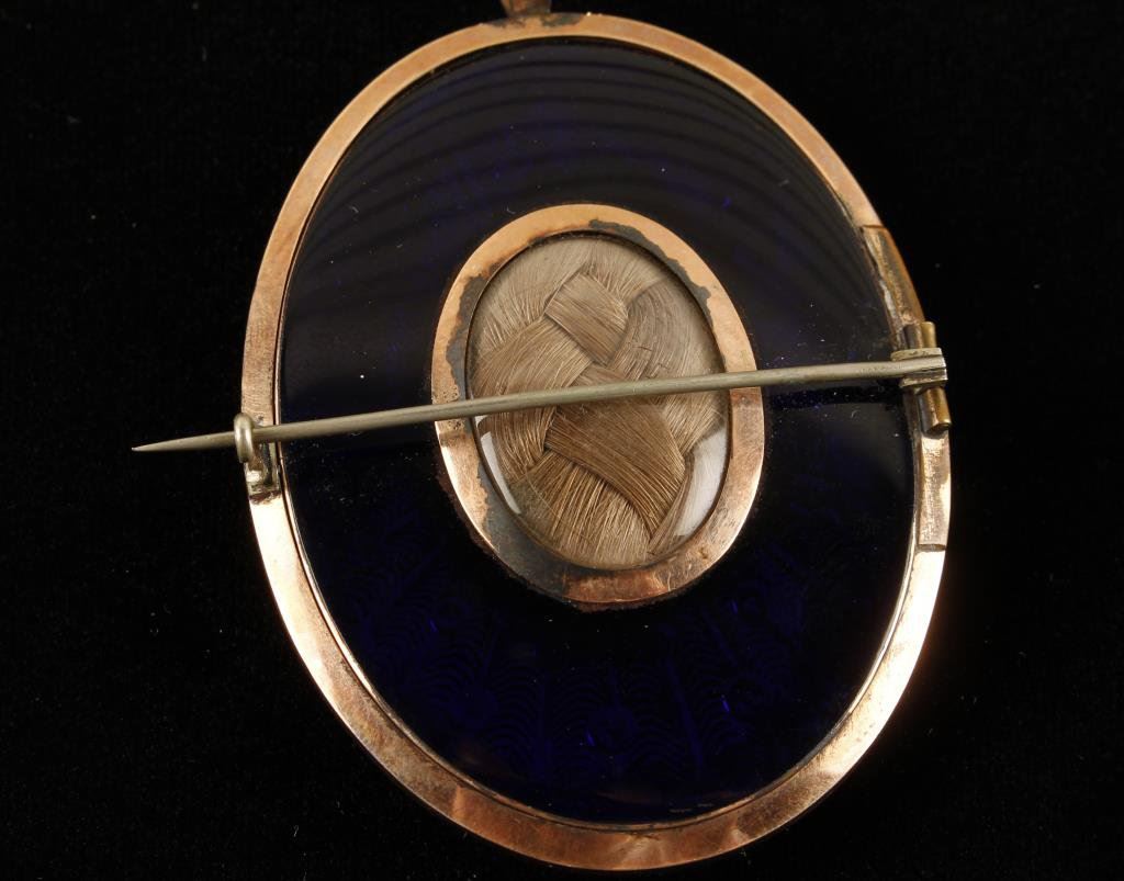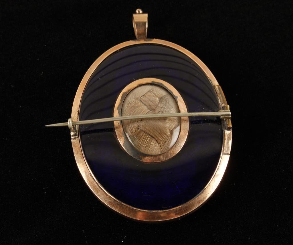 Antique locket circa mid 19th century engraved with the initials “L.C.” Blue enamel with glass on both sides sealing braided hair of a loved one. Could be worn as a pin or pendent on chain. Circa 1850-1870. Gold filled. From gold rush area of Northern California. Est.: $200-$400