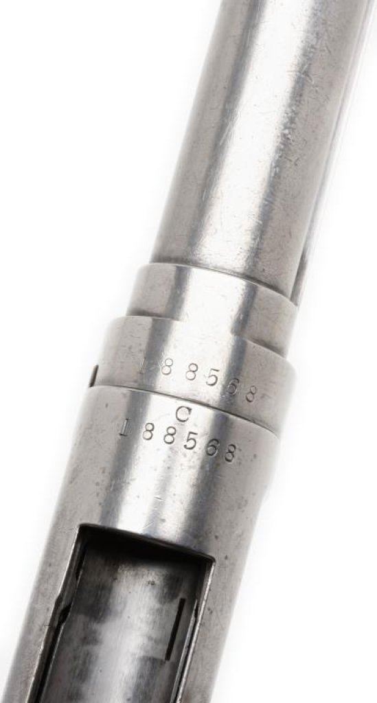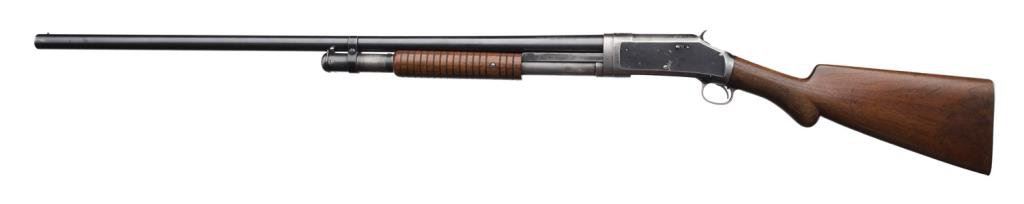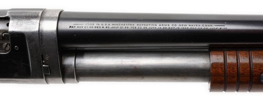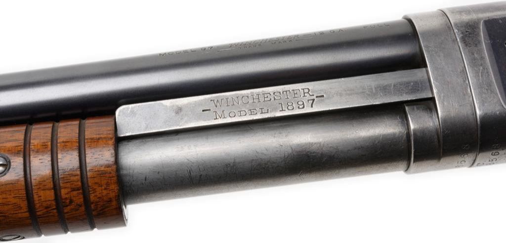 Winchester Model 1897 pump action shotgun, 12 gauge, full choke, 32” barrel, S/N C 188568, blued finish, wood stocks in overall very good to fine condition showing considerable original finish, fine bore, crisp action and markings, very good wood with steel butt plate. Est.: $300-$600.