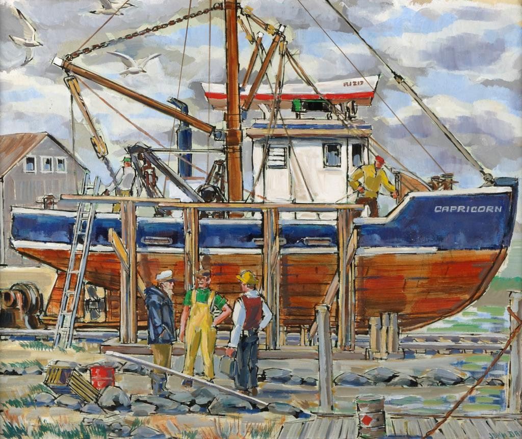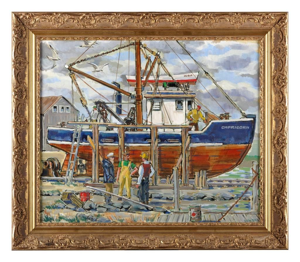 Framed original oil painting on board signed John Day; subject matter is of fishing boat “CAPRICORN” at dock with fisherman; approximately 26” x 30” overall. Est.: $300-$600.