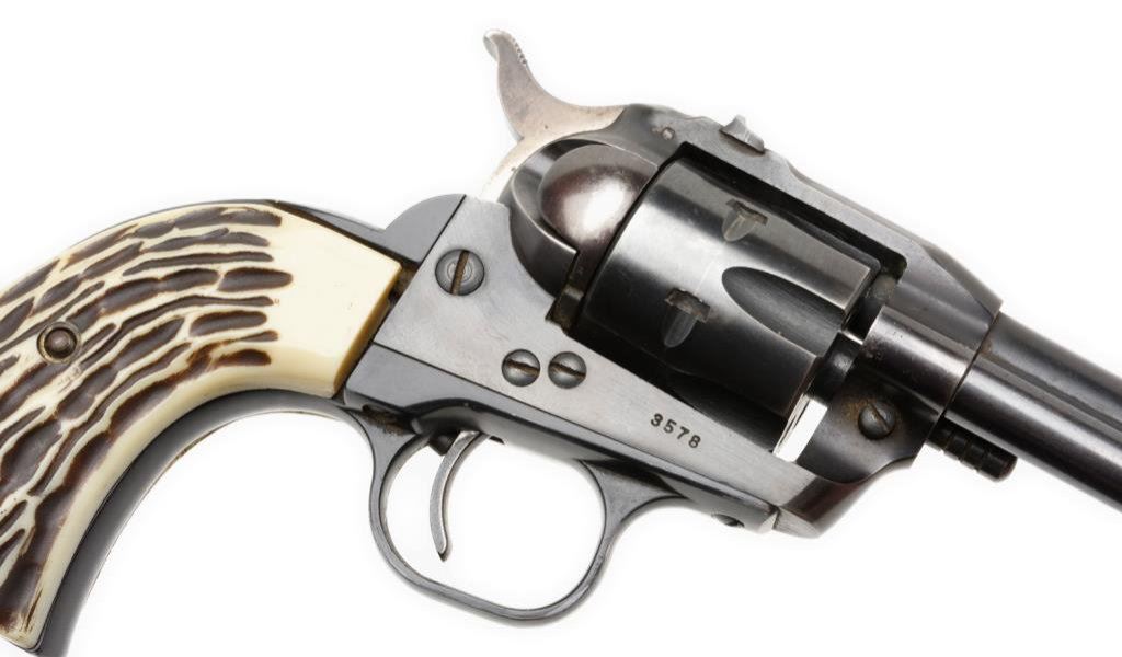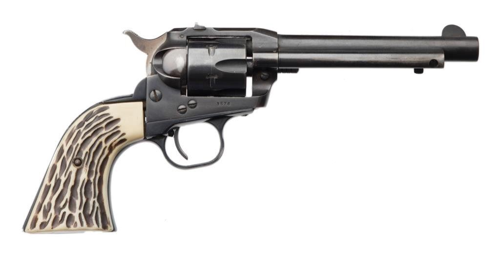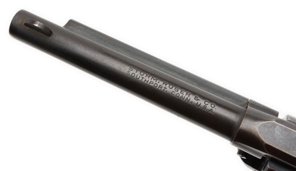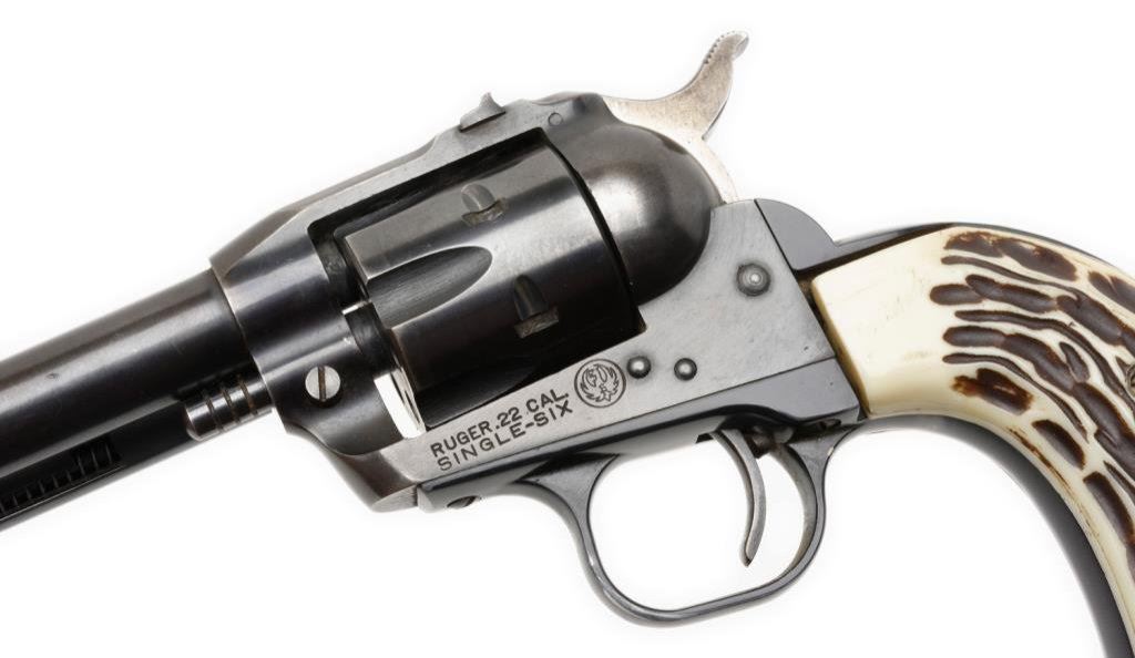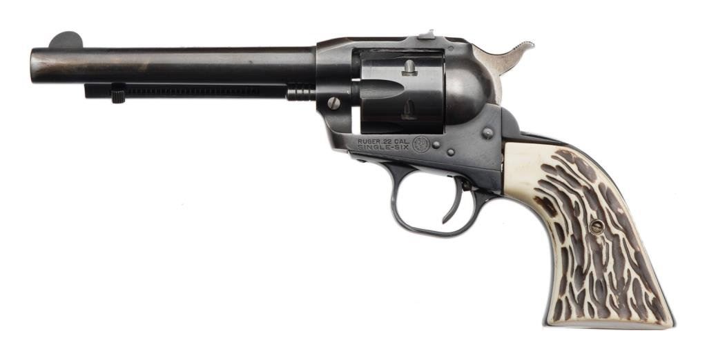 **Early production Ruger Single Six Model Single Action revolver, .22 caliber, 5.5” barrel, S/N 3578, blued finish, faux stag grips in overall very good + condition displaying the majority of its original blue with some muzzle and high point wear; crisp action, very good + bore and very good after market grips. Est.: $200-$400.