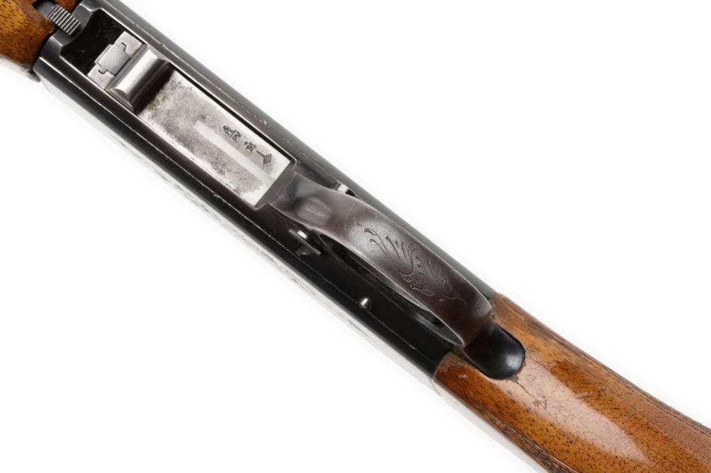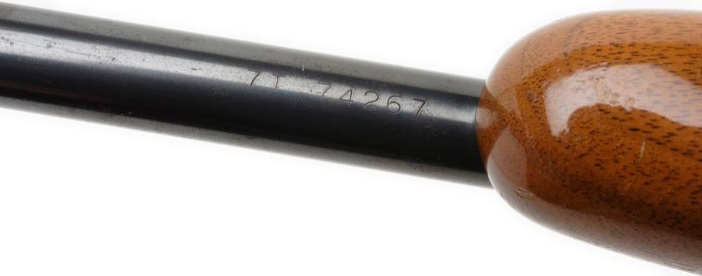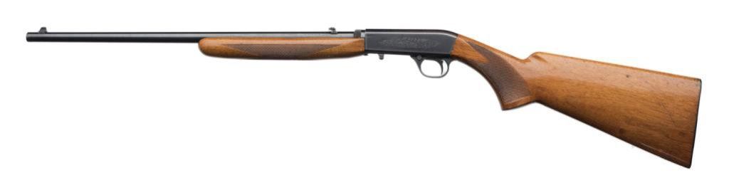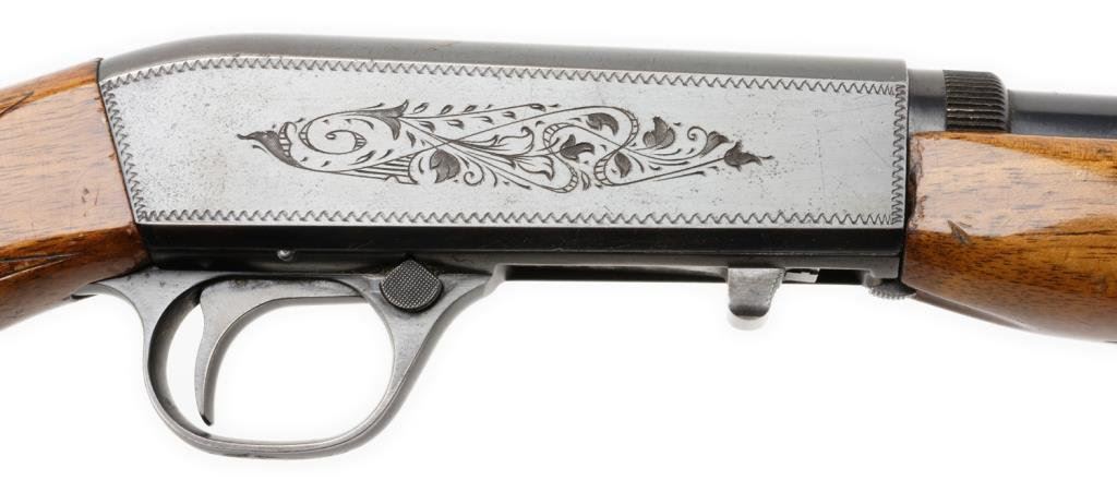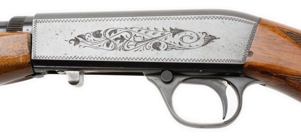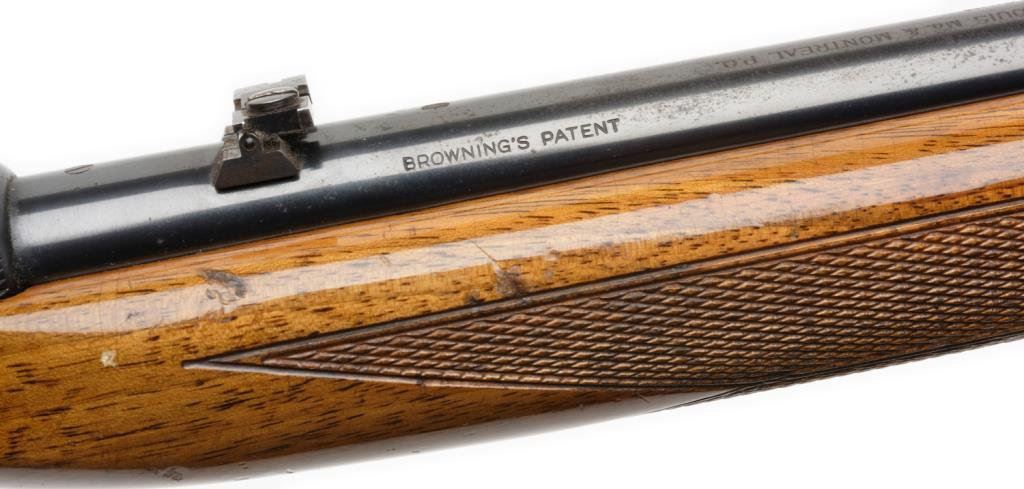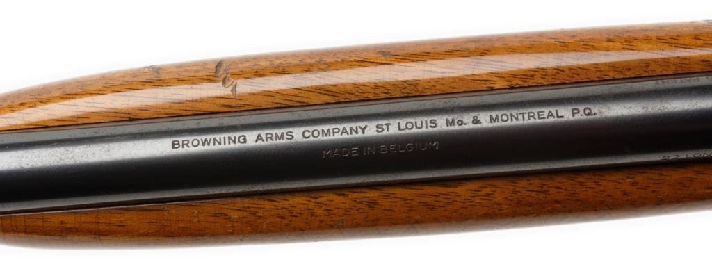 **Belgian-made Browning semi-automatic rifle, .22LR caliber, 19” round barrel, S/N 7T 74267, blued finish, engraved receiver, checkered wood stocks. This gun is in overall fine condition displaying the majority of its original blue finish with high point wear confined primarily to the frame. The action is crisp, the markings sharp and the bore fine. The wood stocks are very good to fine with some scattered mars and scratches from storage. Est.: $350-$700.