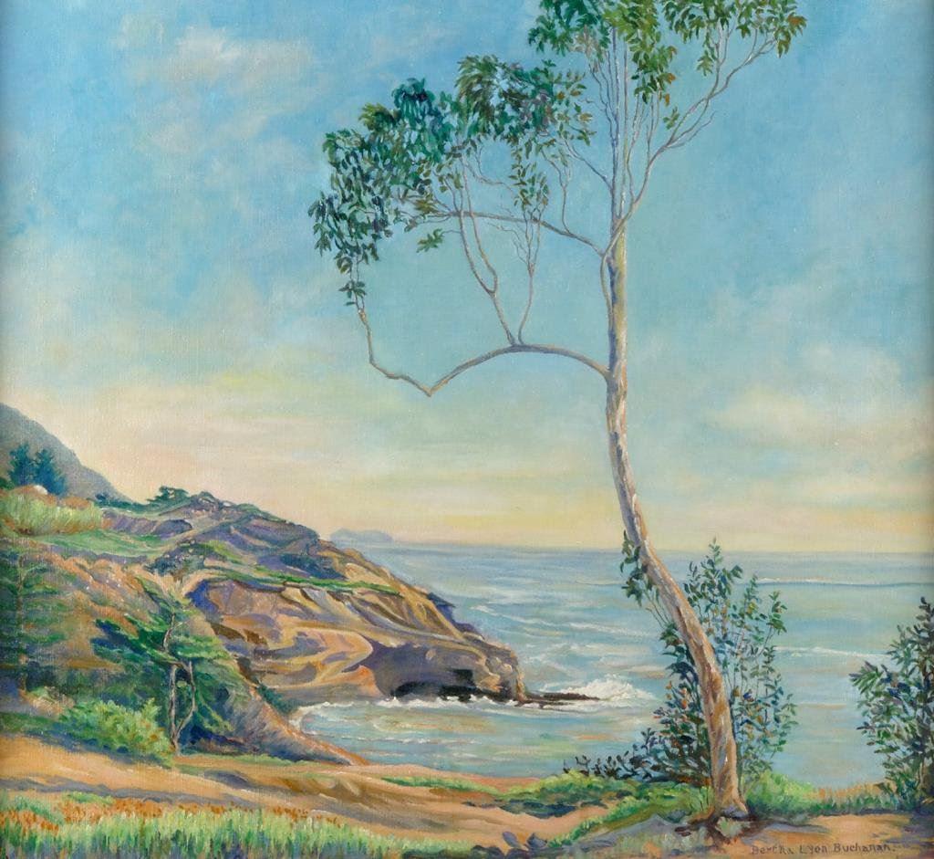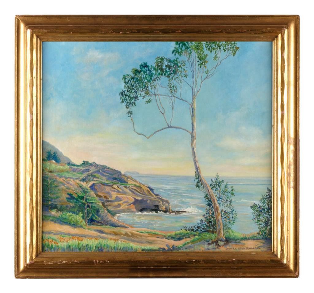 Framed oil on canvas by Bertha Lyon Buchanan (1879-1945), born in Pennsylvania and settled in San Diego, CA in 1925. Subject matter is of a Southern California coastal scene entitled “Wind and Flea”, approximately 28” x 29” overall. Nicely accomplished. Est.: $400-$800.