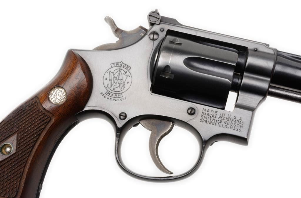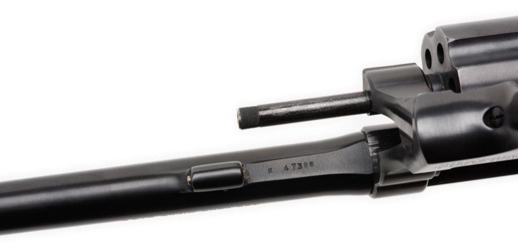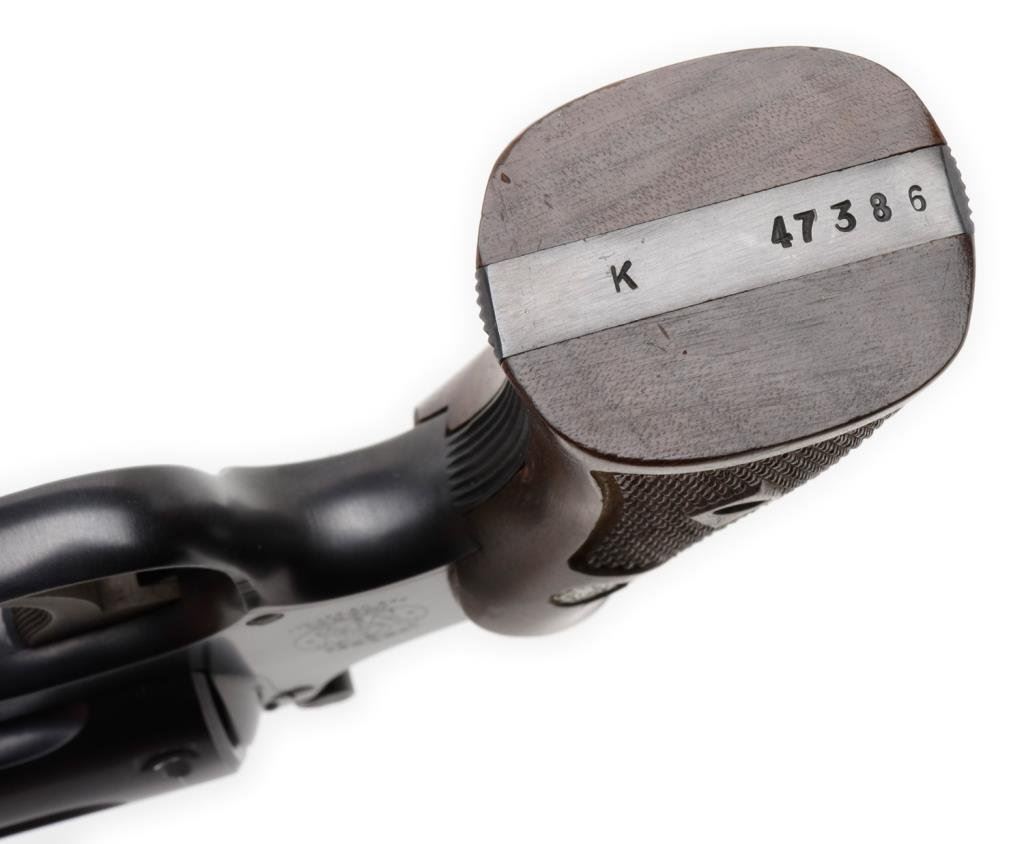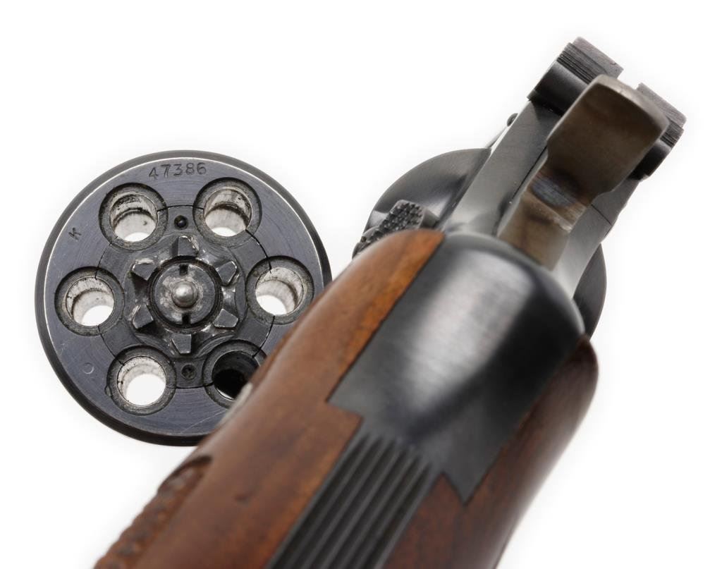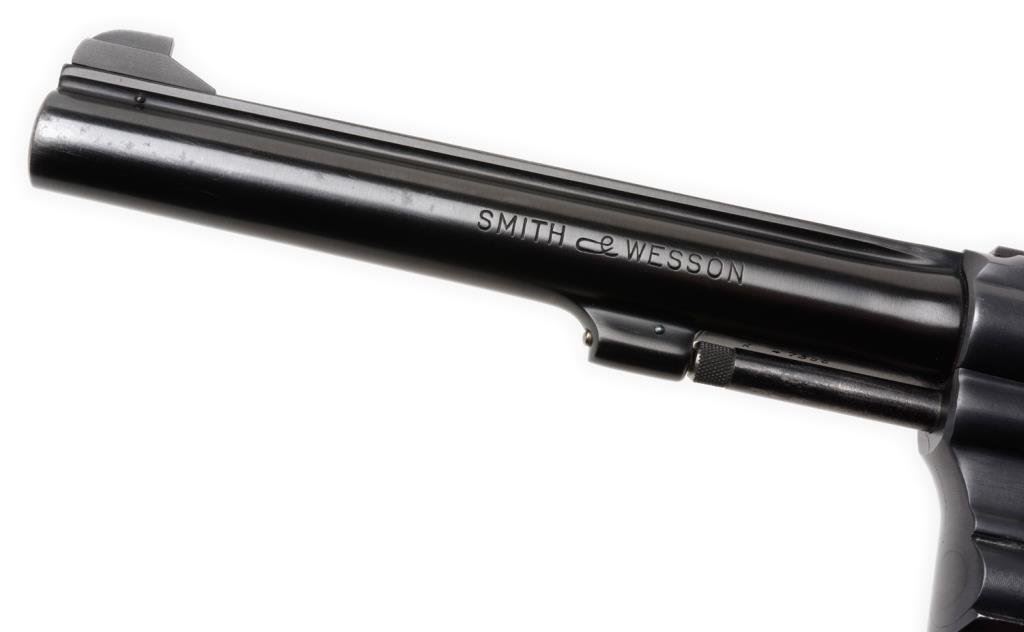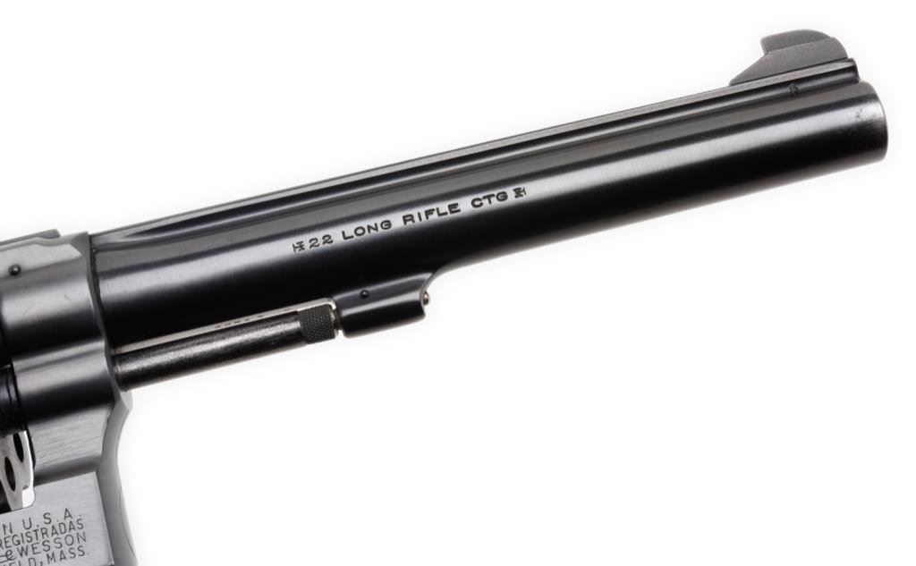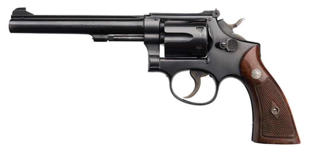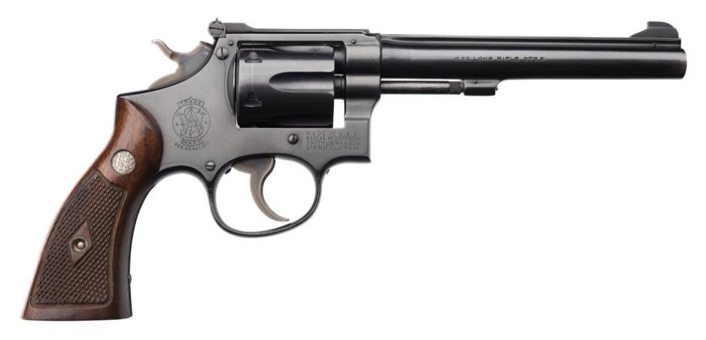 Smith & Wesson 5-screw DA K-22 revolver, .22LR caliber, 6” barrel, S/N K 47386, blued finish, adjustable rear target sight, checkered wood medallion grips. This revolver is in overall fine to excellent condition showing the majority of its original finish with some minor muzzle wear. The action is crisp, the markings are sharp, the bore is fine and the grips are also fine. Est.: $300-$600.
