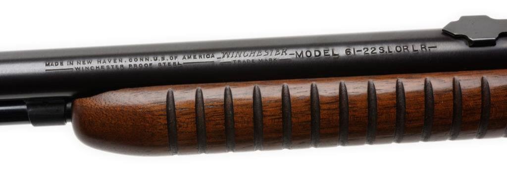 Winchester Model 61 pump action rifle, .22 short, long or LR caliber, 24” round barrel, S/N 149928, blued finish, wood stocks in overall fine to excellent condition showing little use; approx. 99%+ original finish, fine bore, action, markings and wood with a couple old mars from storage. Est.: $600-$1,200.