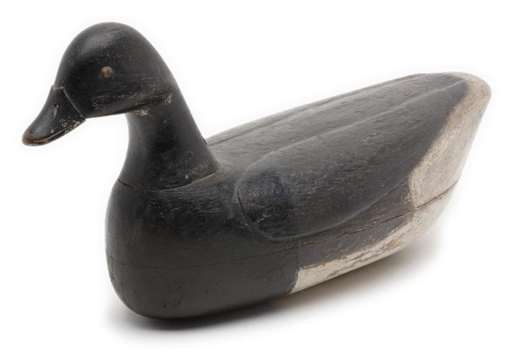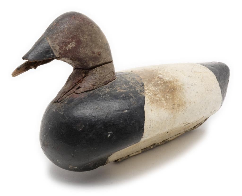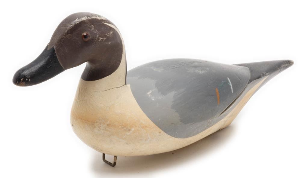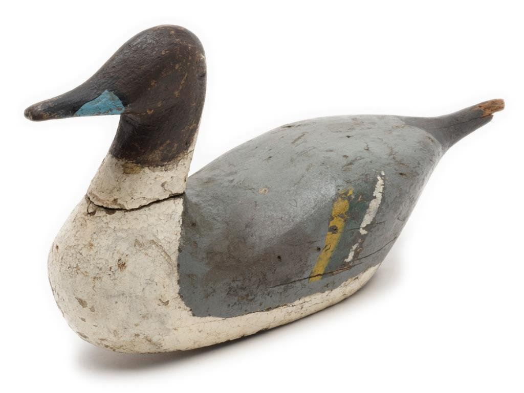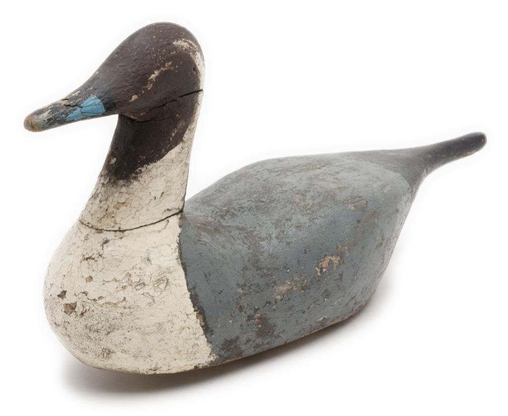 Lot of 6 carved and painted old wooden duck decoys including a near pair of pintail ducks each approx. 18” x 5” x 10” with considerable original appearing paint (blue, black white, green and yellow) in fair + condition showing some scattered wear, cracks and old termite damage to one); also a black and white painted old decoy in good to very good condition, approx. 17” x 6” x 8”; another retaining the majority of its original appearing black, white and brown paint with weight and anchor hook, approx. 16” x 7” x 8” in overall good condition; also a grey, white and brown painted decoy with glass eyes, weight and securing hook marked “COMINS”, approx. 18” x 6” x 8” and in good overall condition. Lastly, a black, white and brown decoy, lead weighted with damage to the beak area, approx. 13” x 6” x 8”. Est.: $300-$500.