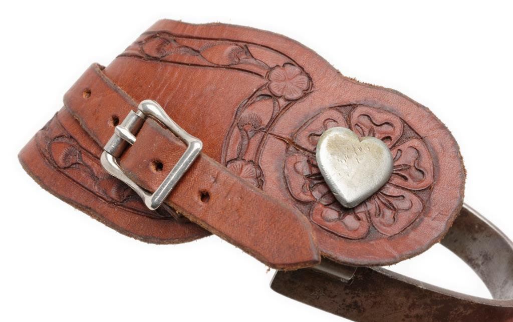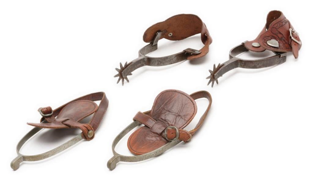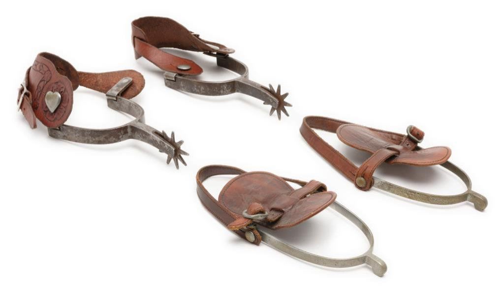 Two pair of spurs; one pair marked “FORGED STEEL” and also marked with a 5 point star, 1-3/4” 9 point rowels with tooled leather straps. The other pair is unmarked and of the “Trooper’s spur” style having no rowels; leather strap. Est.: $350-$700.