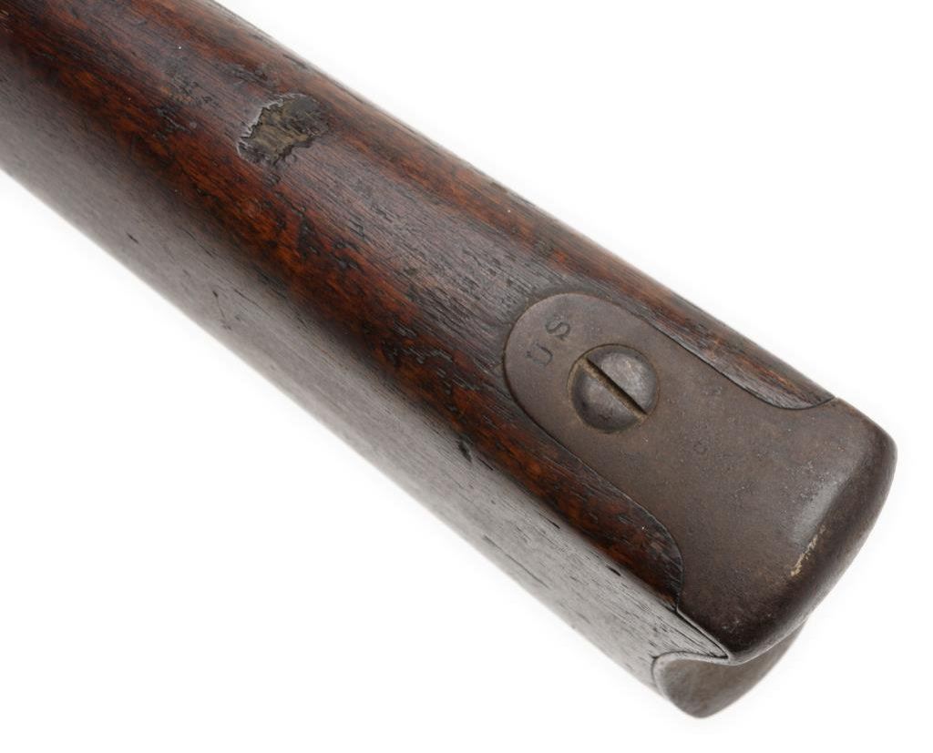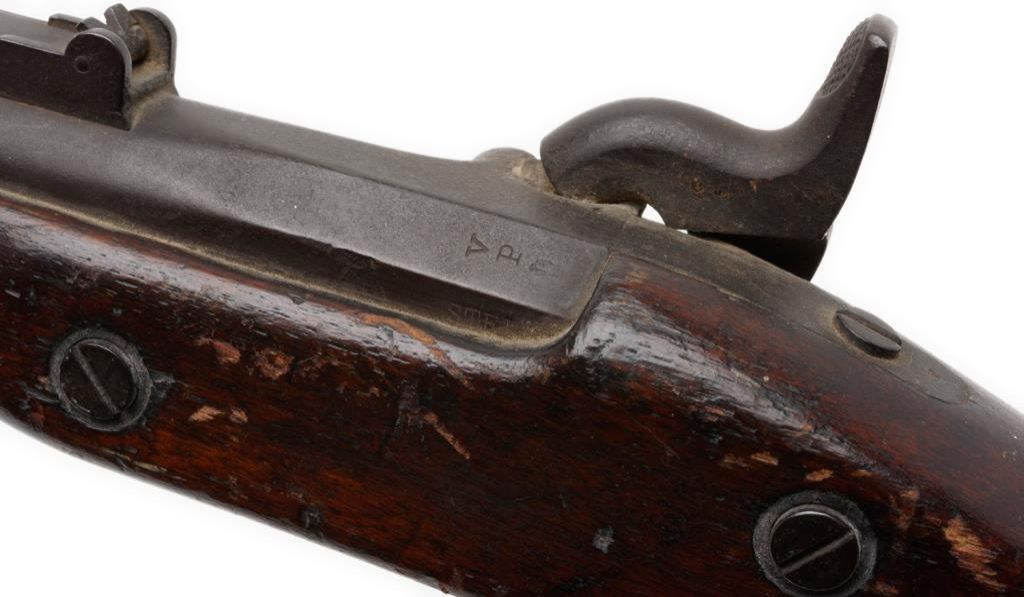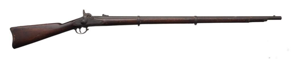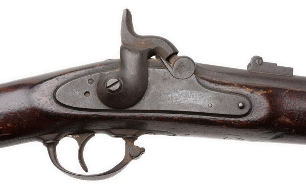Colt Model 1861 percussion musket, .58 caliber, 40” barrel, No S/N, dark patina, full length wood stock. This desirable Civil War era musket is in “out-of-the-attic” condition showing a heavy dark uncleaned patina to metal surfaces. The action is good, the markings visible with the lockplate dated 1863. The wood stock also shows a heavy dark patina and is in good overall condition with scattered mars, scratches and some staining from carry and storage. The top of the butt plate is marked “U.S.” and the bolster of the percussion nipple displays a spread American eagle. The left side of the barrel at the breech is proofed with the standard “V” and “P” over an eagle head. The front barrel band is long missing. This gun is accompanied by a typed note stating the following: “History of this muzzle Loader; My parents purchased the farm in Pennsylvania in April of 1921, from the Kallsar family. The seller said that the gun belonged to their son who fought in the battle of Gettsburg. They were in their early 80’s and said that they had no use for the gun. Ted Revak”. A classic looking Colt musket that may be further researchable. Est.: $800-$1,600.