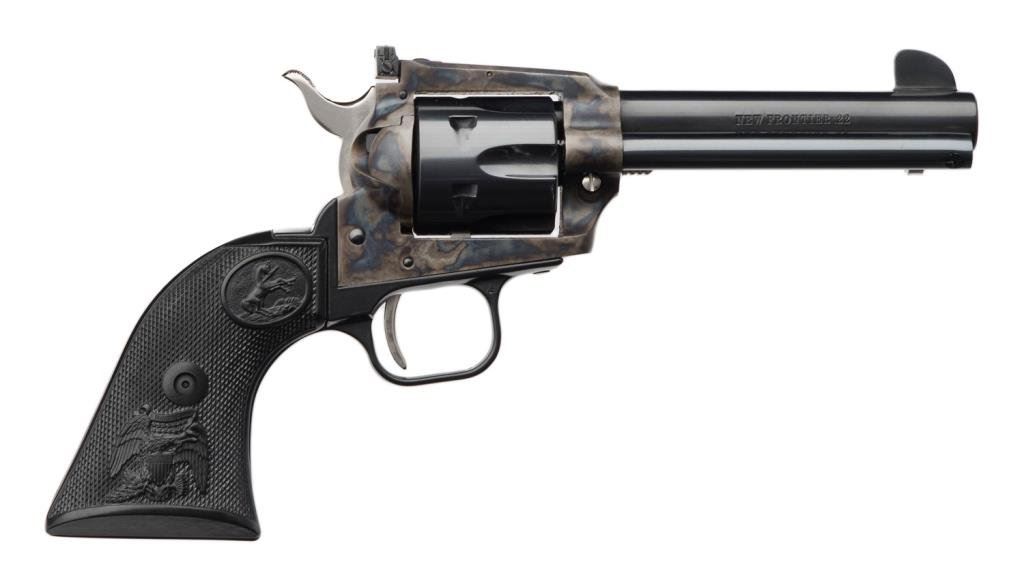 **Colt New Frontier SAA John Wayne (“The Duke”) commemorative revolver.22 caliber, 4.375” barrel, S/N G209502, blued and case hardened finish, checkered black plastic eagle grips with factory presentation wood casing marked “The Duke” on the top of the lid and red velveteen lining inside. Also included are the instructions manual, misc. paperwork and metal commemorative plaque for the inside of the display case. This gun and casing are in excellent minty condition with fine finish to metal surfaces including fiery case colors on the frame. Est.: $800-$1,200.