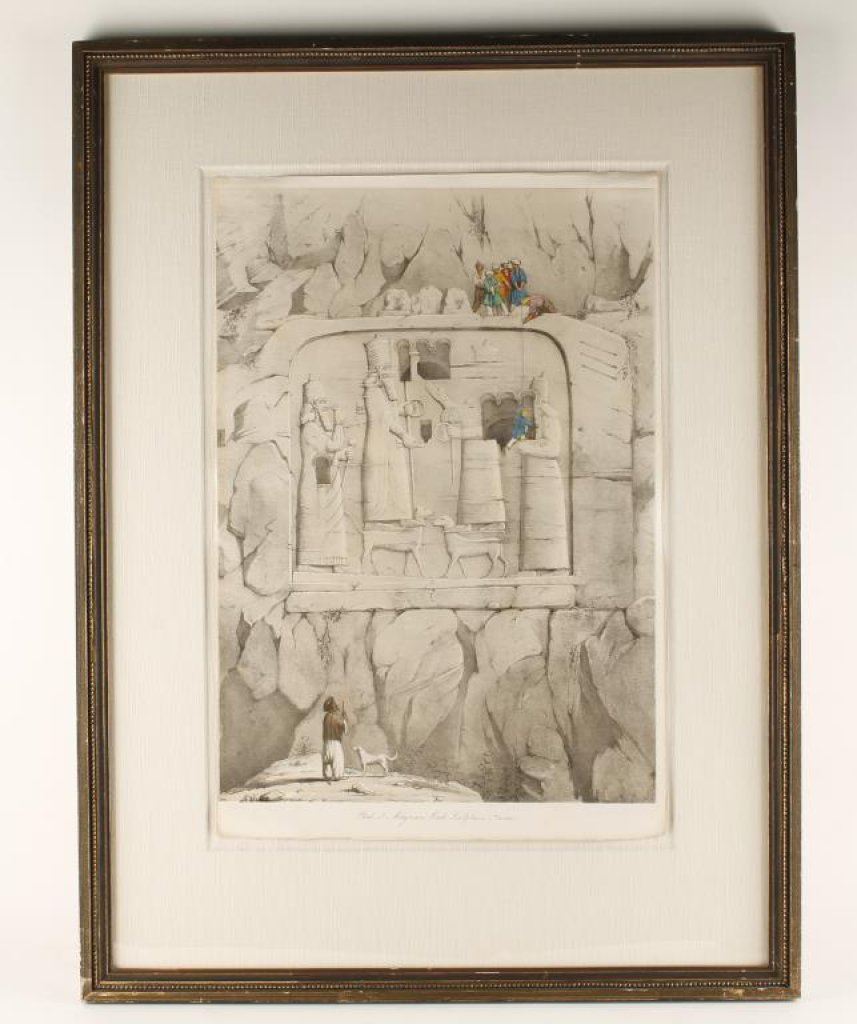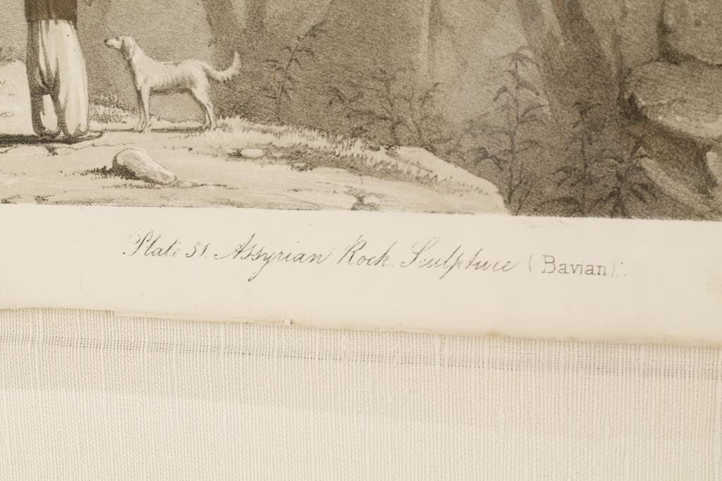 Early steel engraved print of Assyrian rock sculpture. Hand colored with minor damage to the edge. Otherwise very good condition. Professionally framed. Measures 22 1/4" x 15". Est.: $300-$600