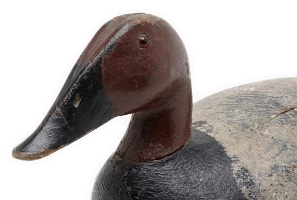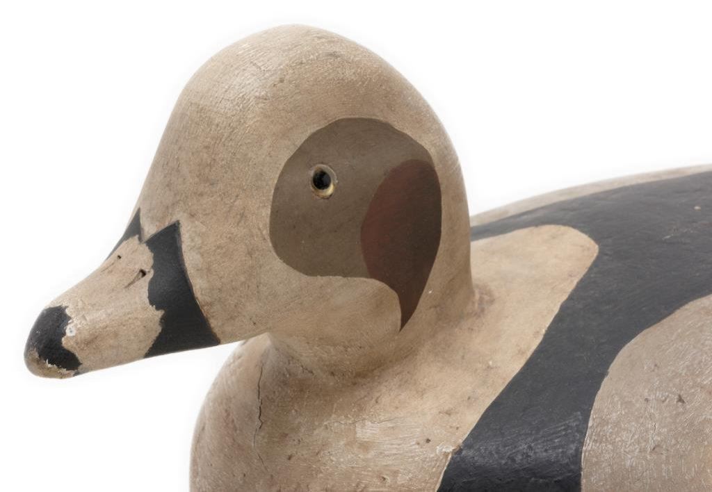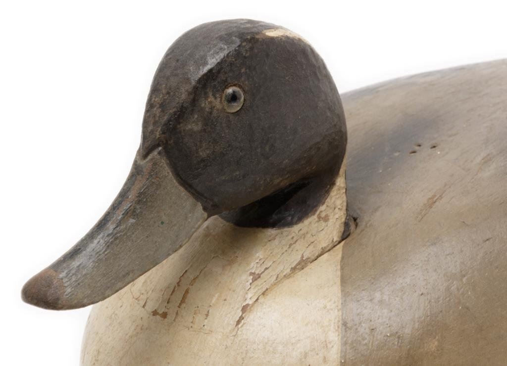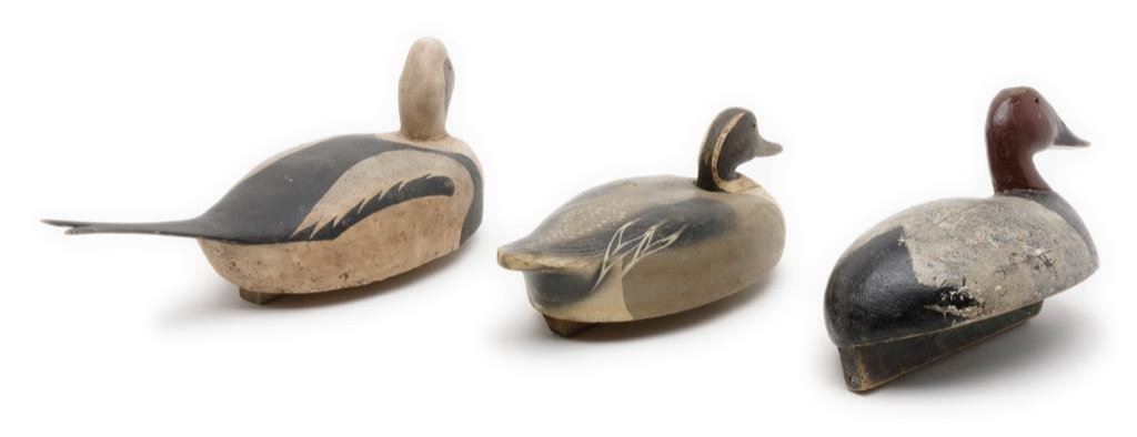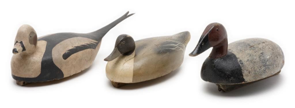 Lot of 3 carved and painted wooden duck decoys. First, a black, white and reddish brown old decoy with glass eyes and approx. 17” x 7” x 8-1/2” in size and in overall fair to good condition with paint appearing to be original. Second is a decoy with grey, black and white original appearing paint, approx. 15” x 7” x 6-1/2” in size and in overall good condition. Lastly, a pintail decoy in good overall condition with brown, grey white and black original appearing paint and approx. 21” x 7” x 8” in size. Est.: $200-$400.