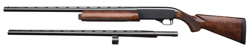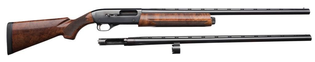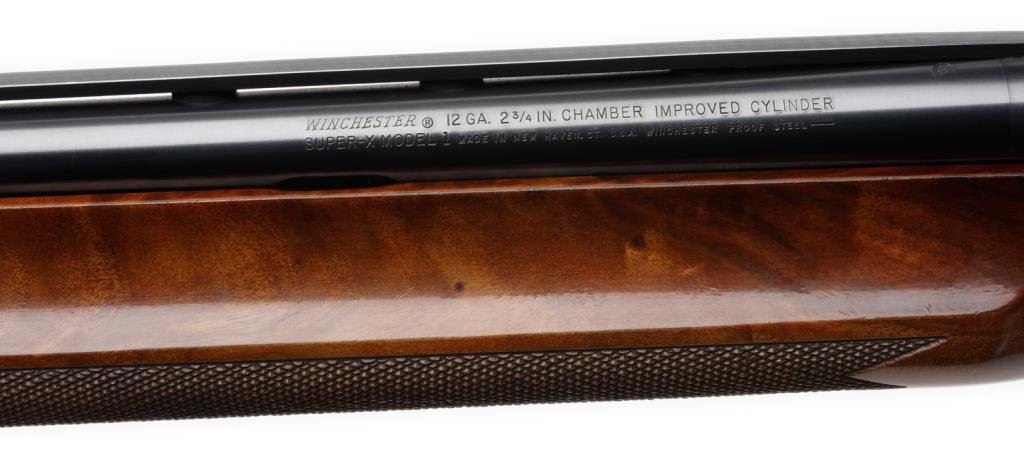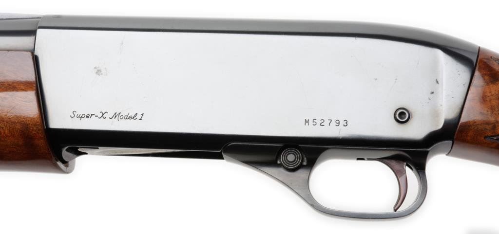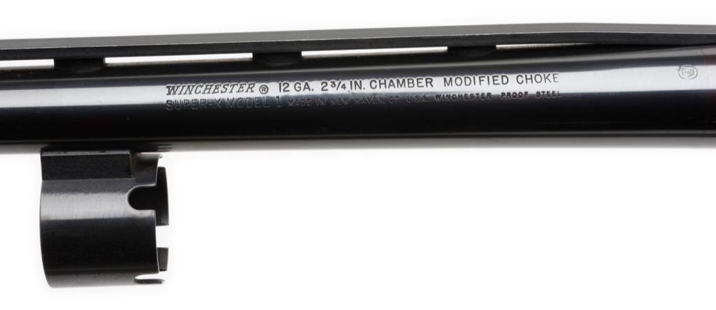 Winchester Super-X Model 1 semi-automatic shotgun,12 gauge, 2-3/4” chamber, Improved Cylinder choke, 26” ventilated rib barrel with extra 28” Modified choke barrel, S/N M52793, blued finish, checkered deluxe wood stocks with Decelerator hard rubber butt pad. This gun is in overall fine condition displaying the majority of its original finish, fine bore in both barrels, crisp action, sharp markings and overall fine wood. Est.: $400-$800.