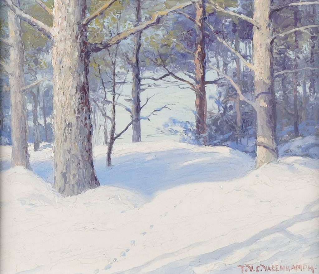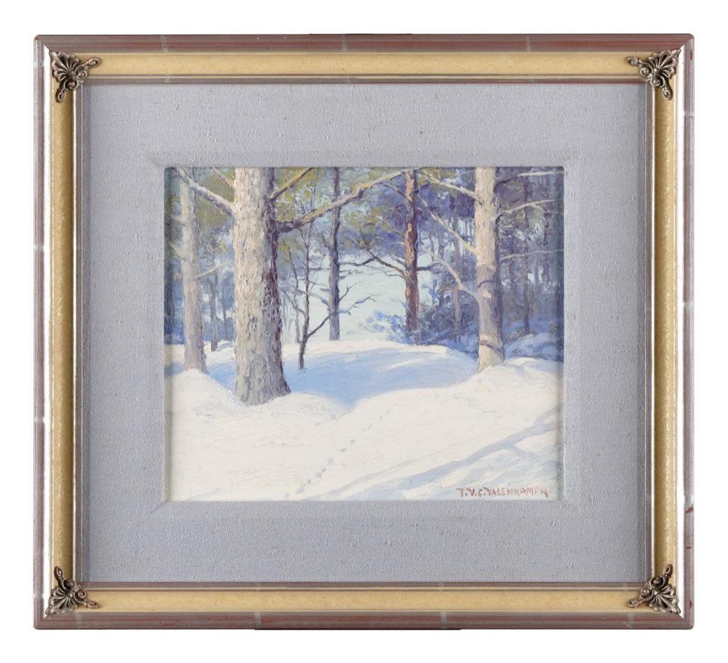 Framed oil on canvas entitled “Winter Scene” by Theodore Victor Carl Valenkamph (1868-1924), approximately 17” x 19” overall; fine depth and shading. Est.: $600-$1,200.
