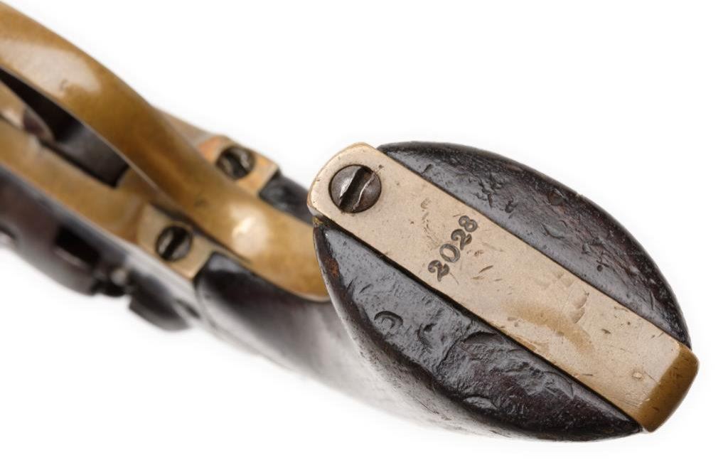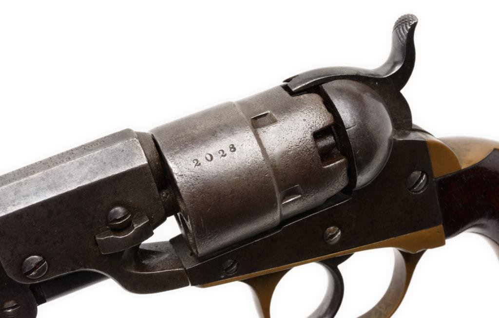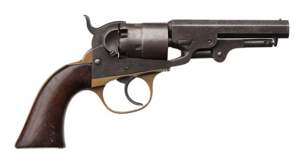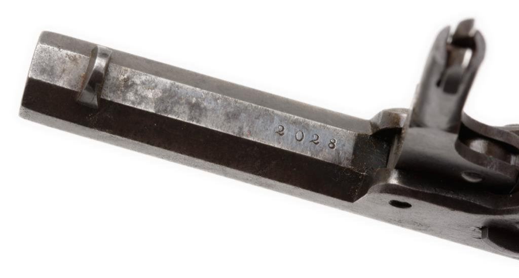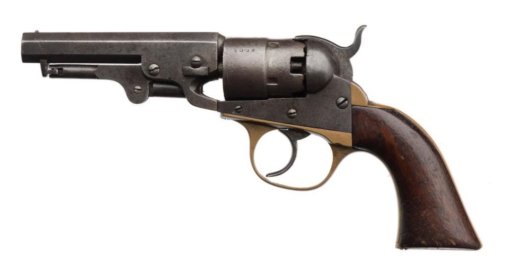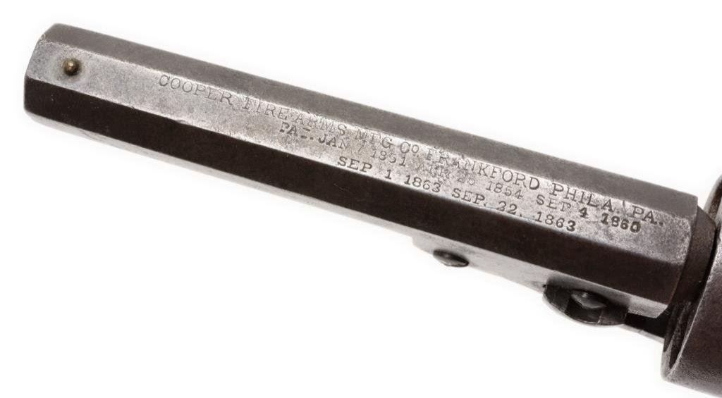 J.M. Cooper DA pocket percussion revolver, Philadelphia plant marking on barrel, .31 caliber, 4” octagon barrel, S/N 2028 (all matching visible numbers), blued finish, brass straps, wood grips. This gun is in overall very good condition showing a dark patina with some scattered pinprick pitting, crisp action, good markings and good to very good grips. Est.: $400-$800.