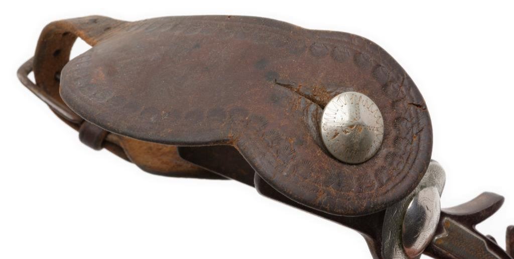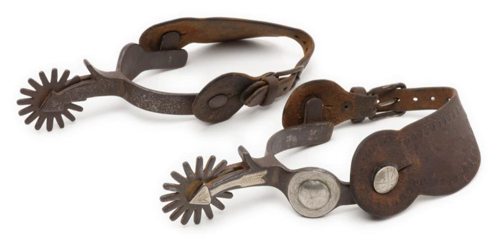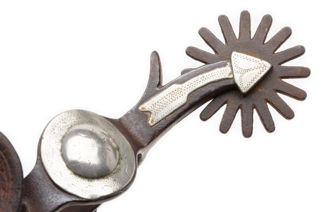 Lot 147 Pair of unmarked spurs with engraved overlaid conchas at rear of heel band