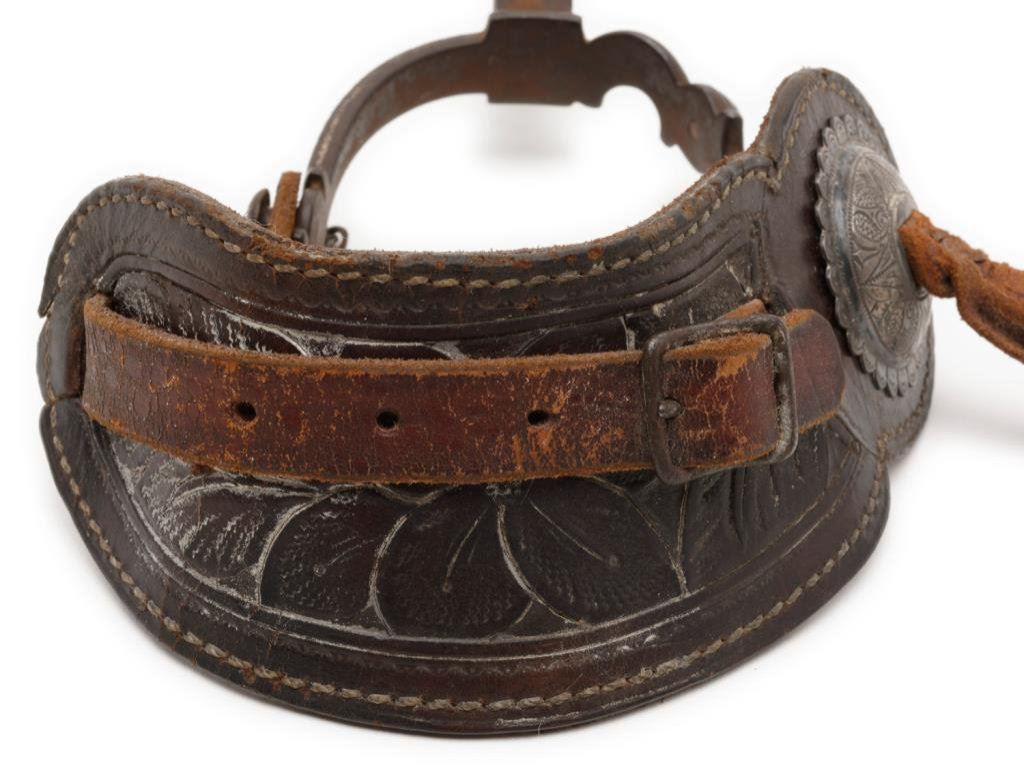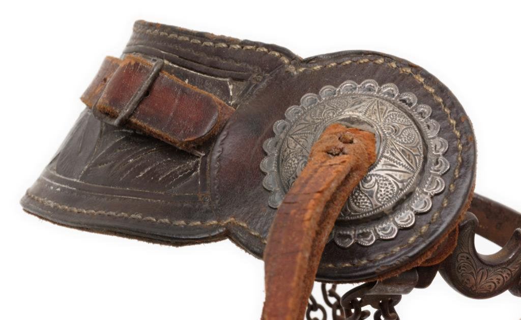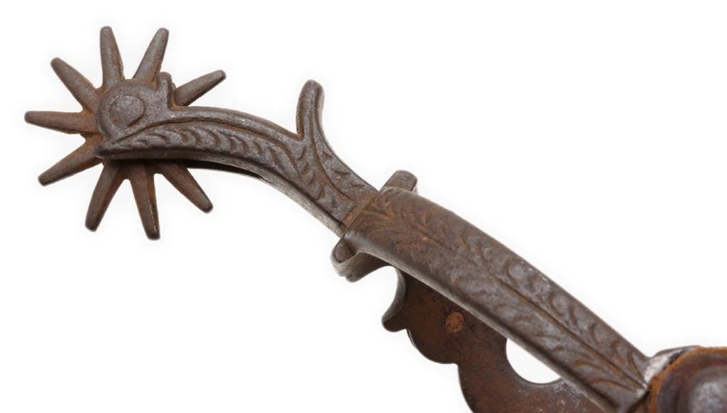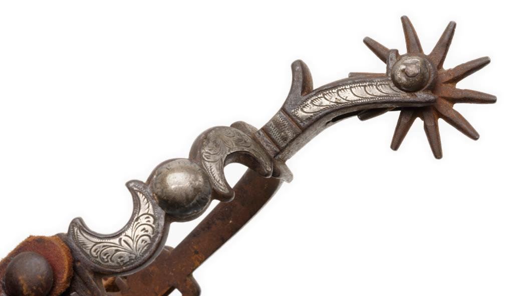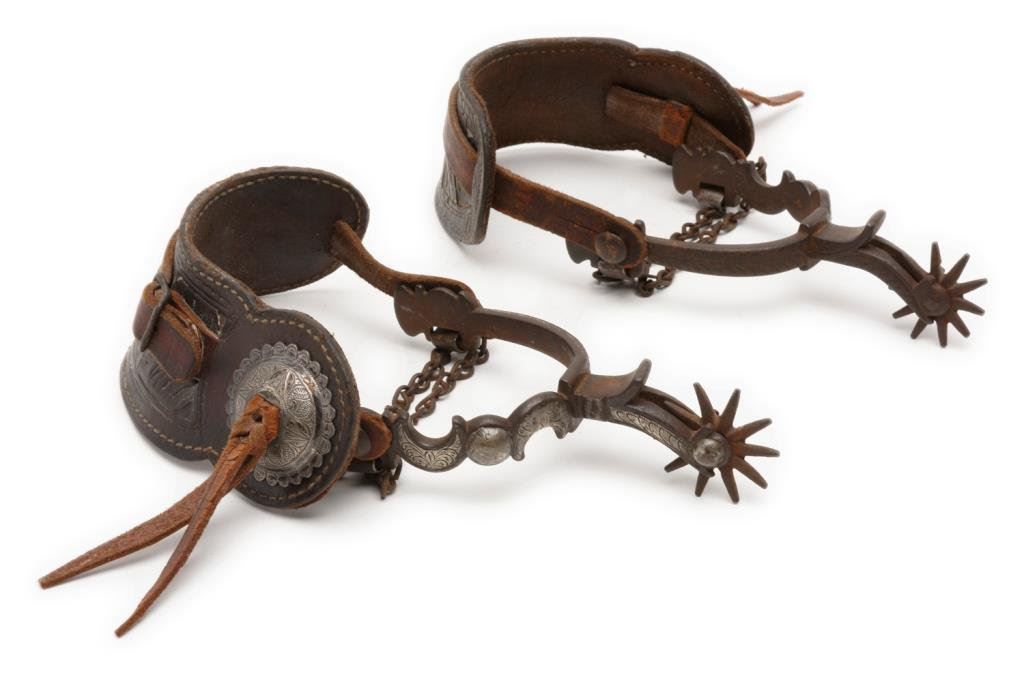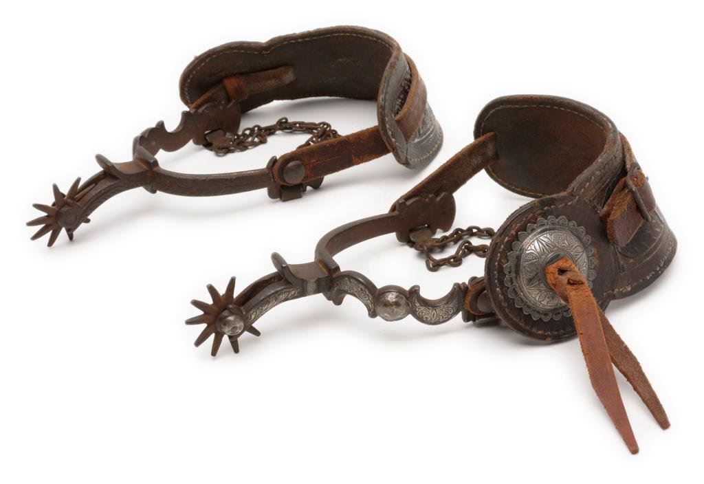 Pair of finely made, unmarked silver engraved and inlaid spurs with half moon designs and 1-3/4” 10 point rowels; heel chains and beautiful two piece old leather straps with engraved conchas. Est.: $500-$1,000.
